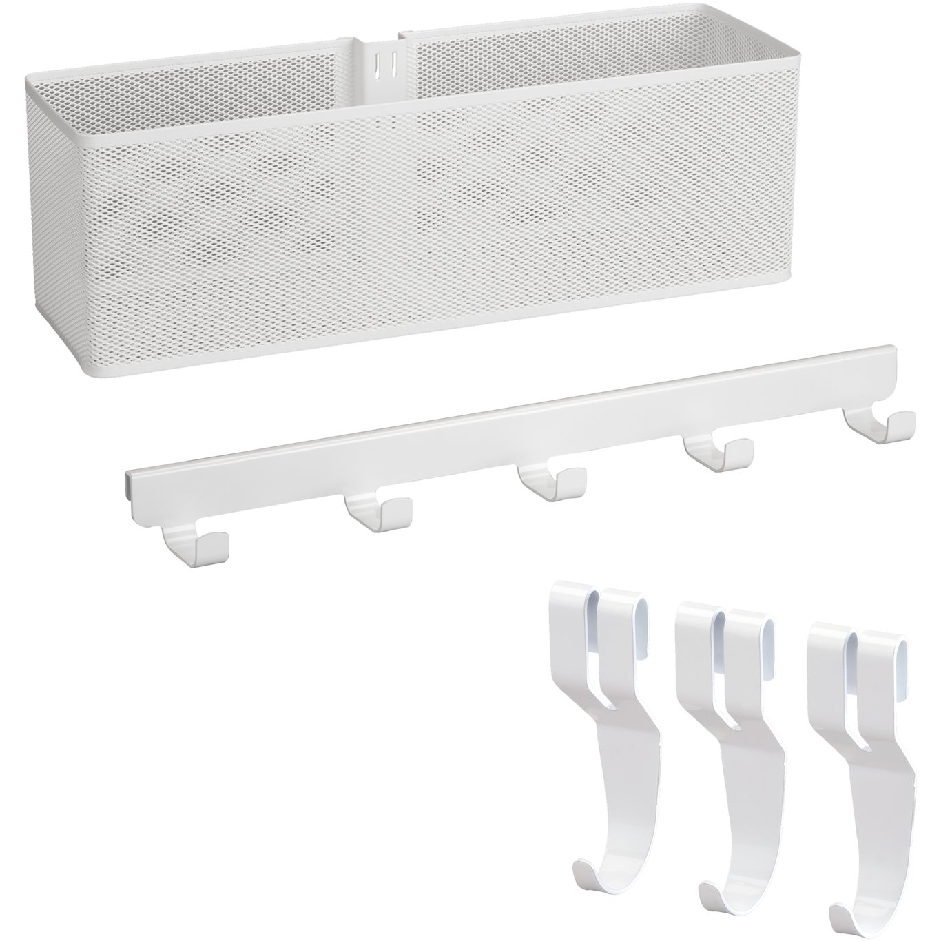 Dette tilbehørssettet fra Elfa inneholder praktiske oppbevaringsløsninger til ditt klikk-inn-system. Består av en krokrekke, tre enkeltkroker og en meshkurv.
