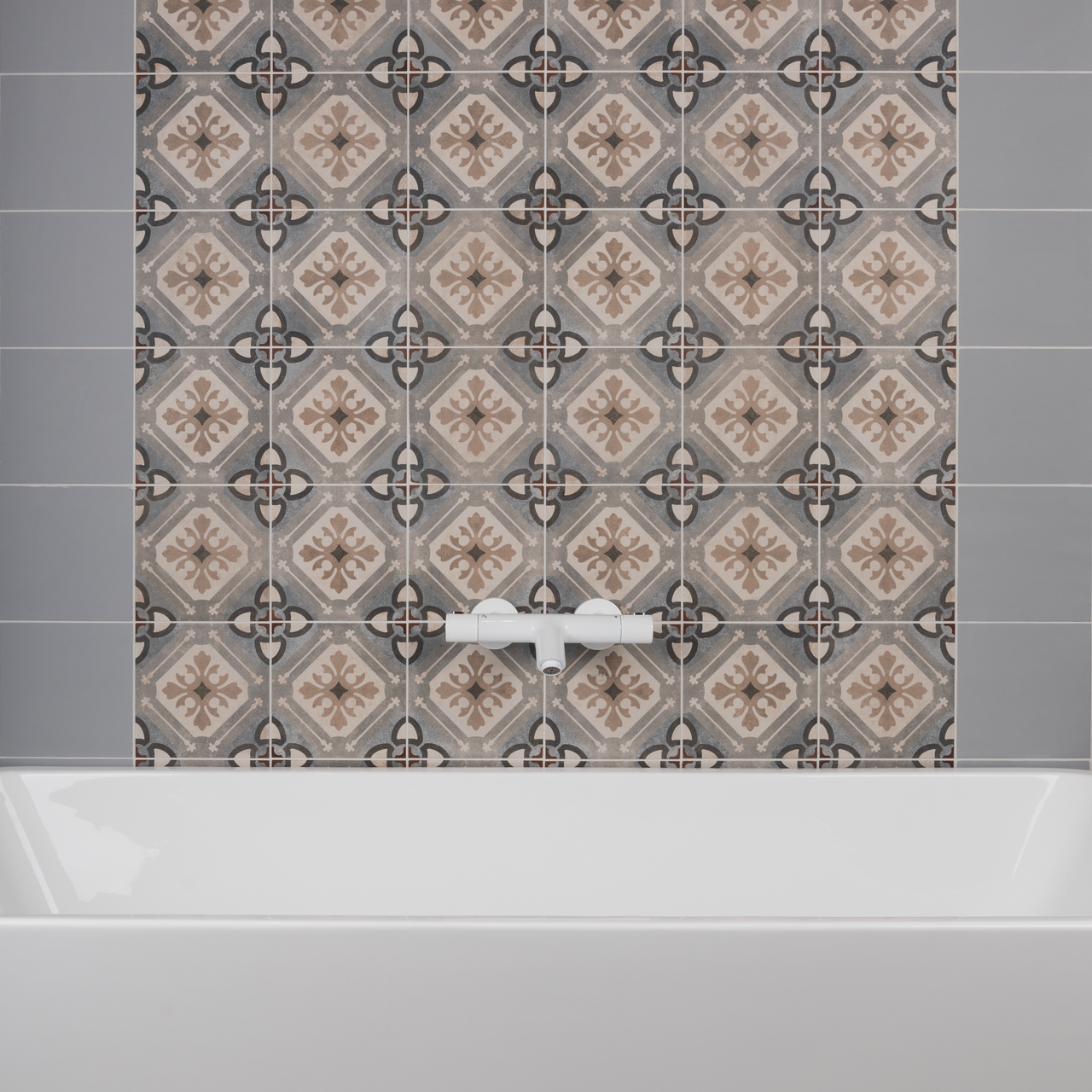 Design Palazzo er en mønstret flis i størrelse 20x20 cm med en halvblank teksturert overflate. Det lekre mønsteret gir en behagelig følelse, samtidig som det beholder et stilrent uttrykk.
