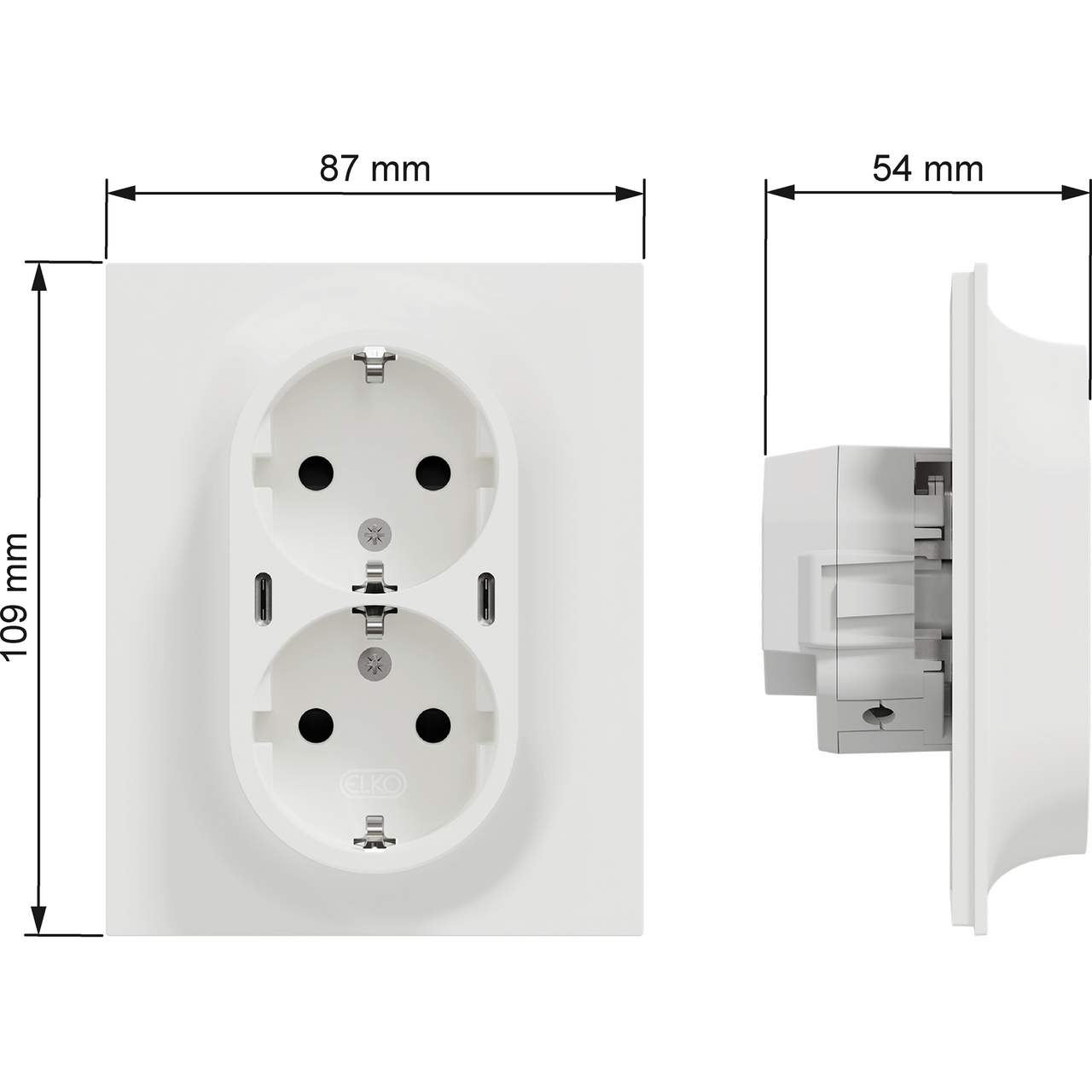 Dobbel jordet stikkontakt i ELKO One-serien med integrerte USB-C-uttak. Produktet er utviklet med Power Delivery-teknologi som tilpasser ladingen etter tilkoblet enhet og sikrer effektiv og skånsom strømforsyning.