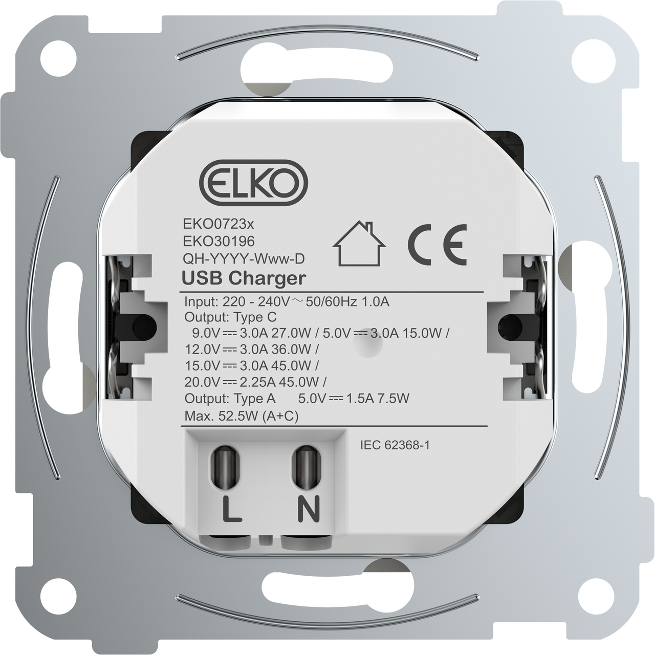 Nominell inngangsspenning: 220-240V~, 50/60Hz, 1,0A.Laderprotokoll: PD 3.0 med pps og andre moduser.Maksimal utgangseffekt: 52,5W.Forventet levetid: 30 000 timer med utgangseffekt 52,5 W (A+C) ved 25 °COverspenningskategori: OVC IIIIsolasjonsklasse: Klasse IIGjennomsnittlig effektivitet i aktiv tilstand: 90,0 %Effektivitet ved lav belastning (10 %): 81,0 %Strømforbruk ubelastet: : 0,08W (i standby)Avmantlingslengde: 7-9mmMaksimalt moment: 0,33NmMaksimalt tverrsnitt: 2 x 2,5mm²Påveggskappe: minimum 33mm.Innbygningsdybde: 32mm.Forskrift om elektrisk utstyr § 21 forplikter Megaflis som tilbyder av elektrisk installasjonsmateriell til å opplyse om at installasjonsmateriell ment for å kunne inngå i et fast elektrisk anlegg kan kun installeres av en registrert installasjonsvirksomhet. Unntatt er elektrisk materiell som utelukkende er ment for bruk i faste teleinstallasjoner, og elektrisk materiell som forbruker selv lovlig kan installere. Her kan du lese mer om hva du har lov til å gjøre selv av elektrisk arbeid: https://www.sikkerhverdag.no/strom/gjor-det-selv/elektrisk-arbeid-dette-kan-du-gjore-selv-av-elektrisk-arbeid/