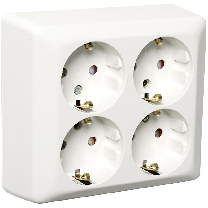 4-veis stikkontakt med jord. Stikkontakten leveres med termoplastkappe, bakplate og barnevern. Stikkontakten kan monteres over en enkel veggboks. Ved å fjerne den interne overkoblingen kan f.eks. den ene halvdelen styres via bryter, mens den andre halvdelen fungerer uten styring av bryter. 4-veis stikkontakt kan påmonteres strekkavlaster, el.nr: 15 118 60. Utsparing for kabel i thermoplastkappen kan utføres med ELKO kniven el.nr: 88 147 60 eller med utsparingstang el.nr: 88 147 54
