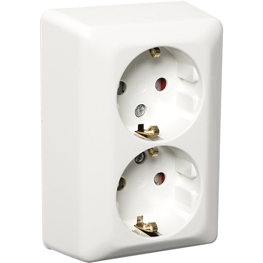 Dobbel stikkontakt påvegg med jord, med barnevern. Leveres med bakplate og termoplast kappe. Overkoblingsklemme L701 kan benyttes (15 114 08). Utsparing for kabel i thermoplastkappen kan utføres med ELKO kniven el.nr: 88 147 60 eller med utsparingstang el.nr: 88 147 54