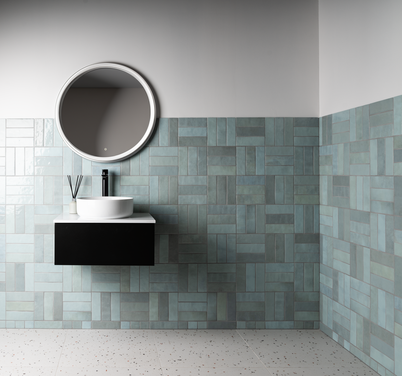 Flisen egner seg godt på både kjøkken og bad, og kan kombineres med ulike elementer for ulike uttrykk. Den kan også legges i fiskebensmønster.