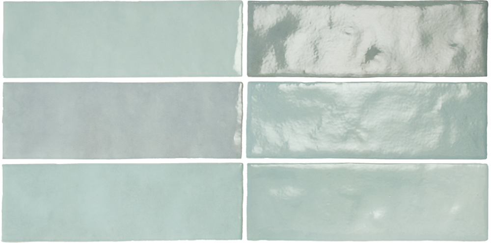 Denne veggflisen i størrelse 6,5 x 20 cm har en bølgete, glatt struktur med variasjoner av duse, blågrønne toner.