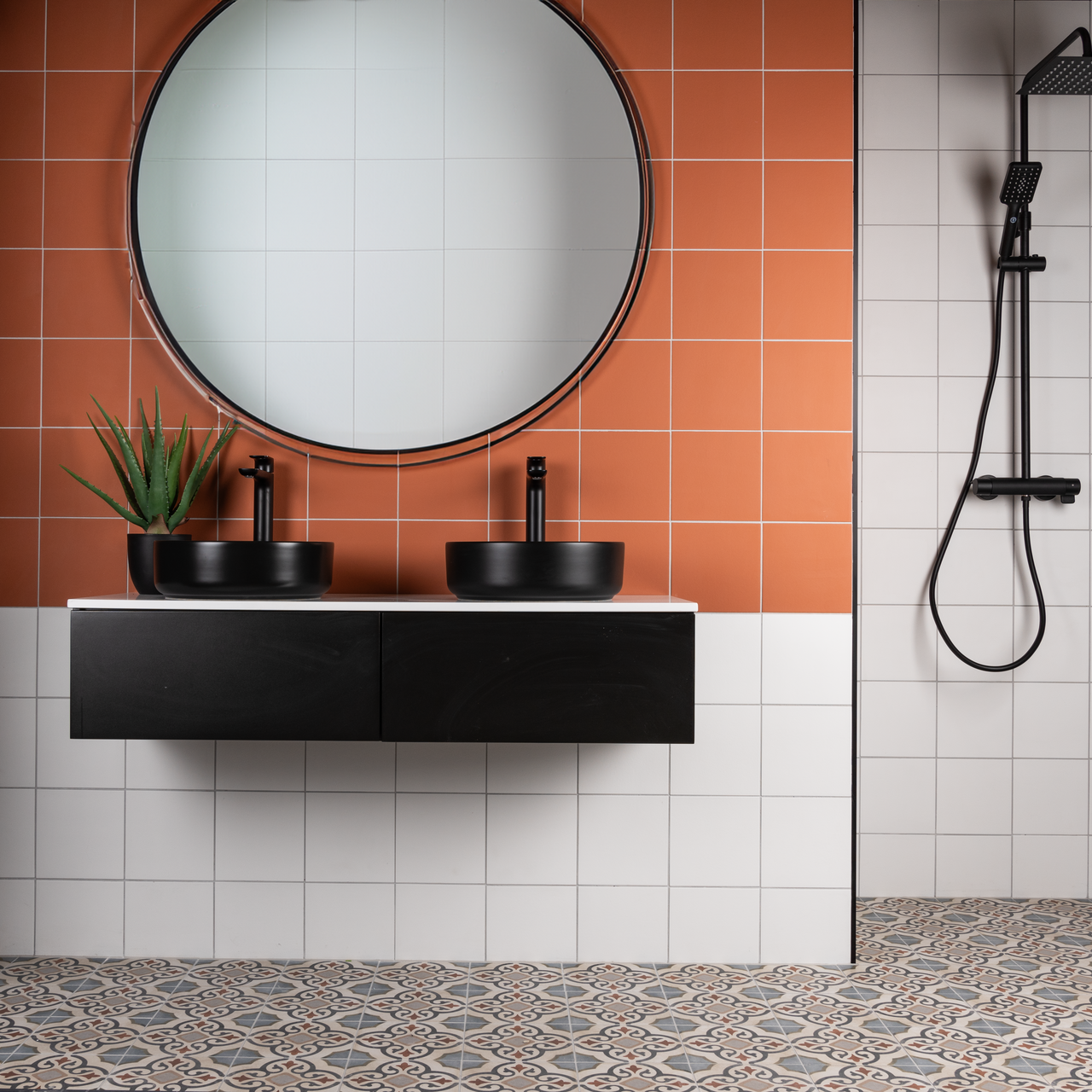 Skap et eget uttrykk på badet eller kjøkkenet ved å kombinere den terracottafargede flisen med de andre fargene og dekorflisene i serien. Den kan for eksempel kombineres med dekorflisen Blatt Warm, og fargene grønn, sort og mer.