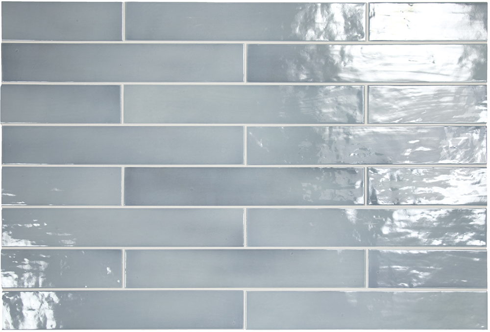 Manacor-serien fra spanske Equipe Ceramicas er en serie keramiske fliser i vakre farger. Denne veggflisen i størrelse 6,5 x 40 cm har en bølgete, glatt struktur med blågrå toner.