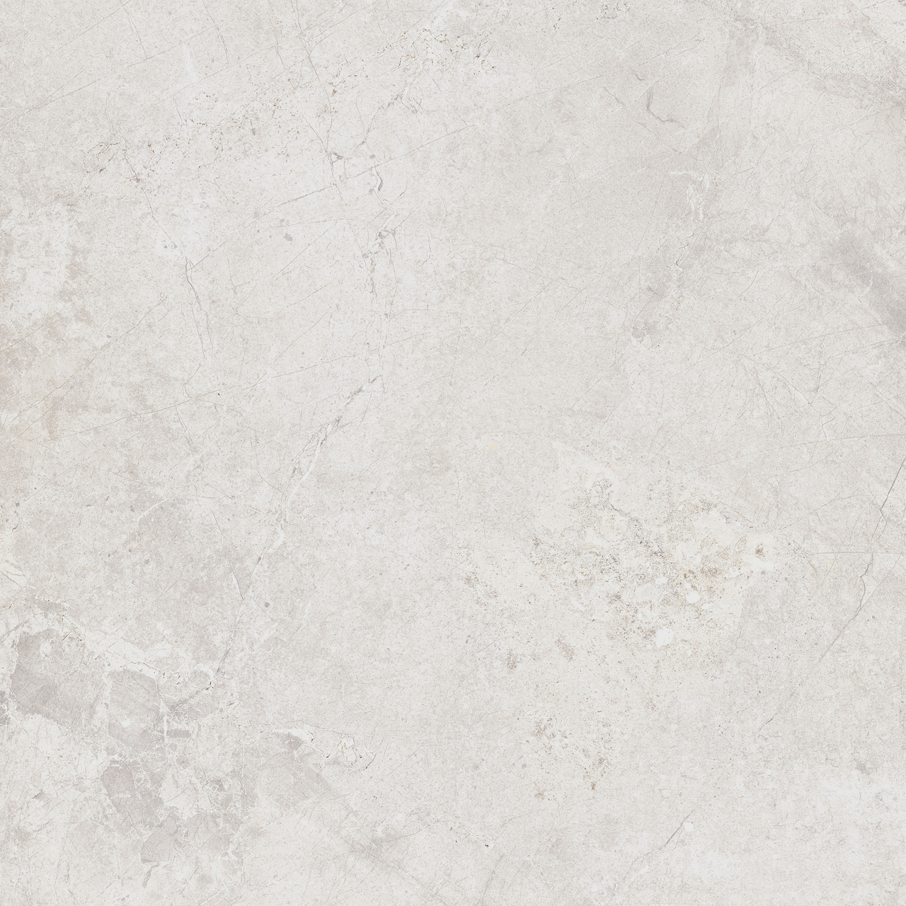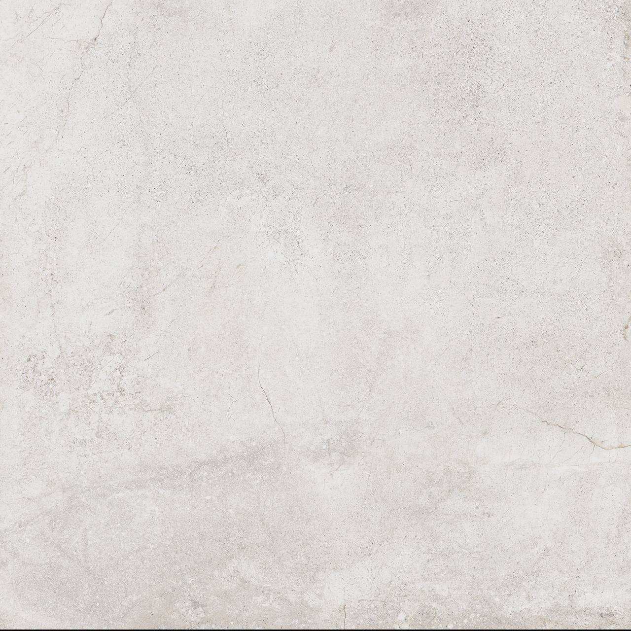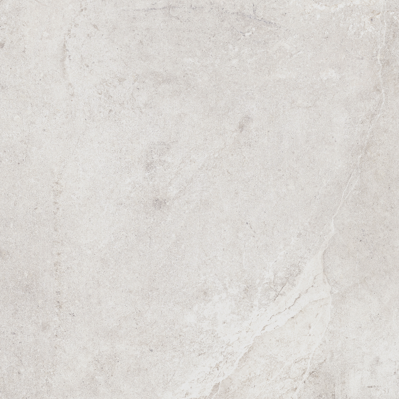 Flisen har en lys, kalkhvit tone med et lett steinpreg, og kan brukes både på gulv og vegg innendørs.