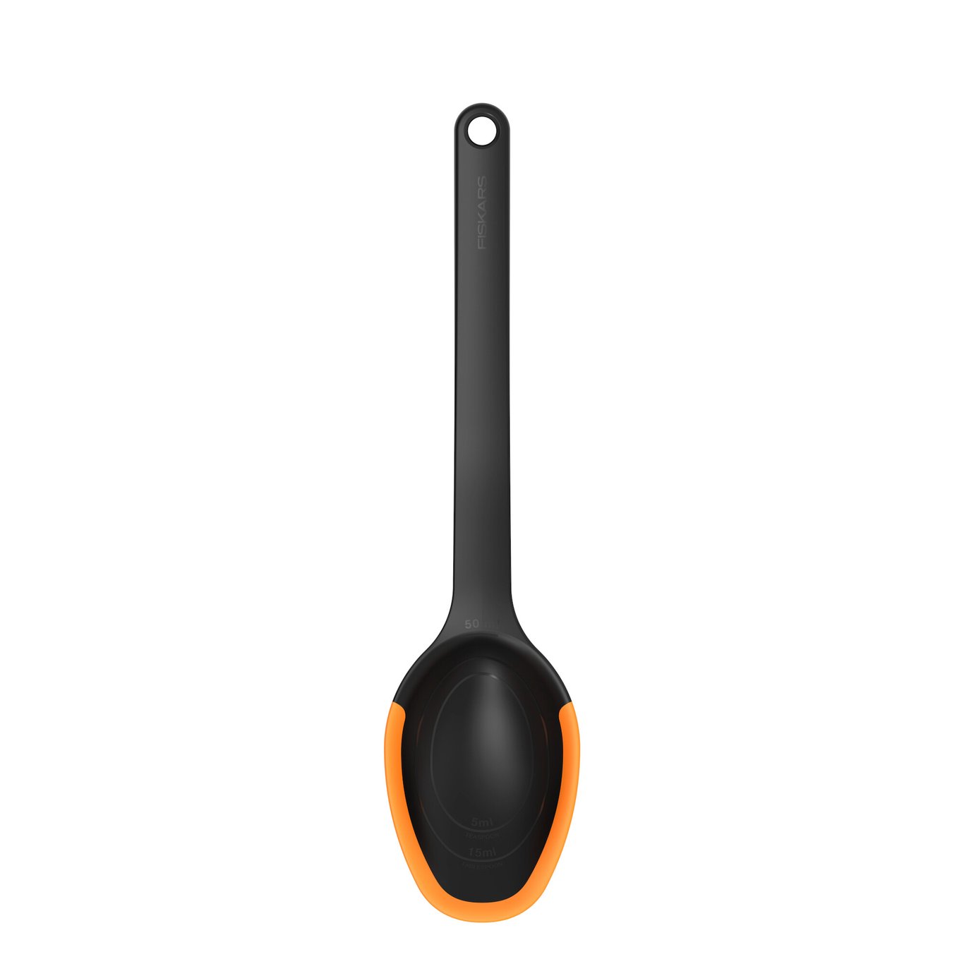 Denne skjeen fra Fiskars har myke silikonkanter så den også kan fungere som en slikkepott. I selve skjeen er det en måleskala for teskje, spiseskje og 0,5 dl. Kan selvfølgelig vaskes i oppvaskmaskin.