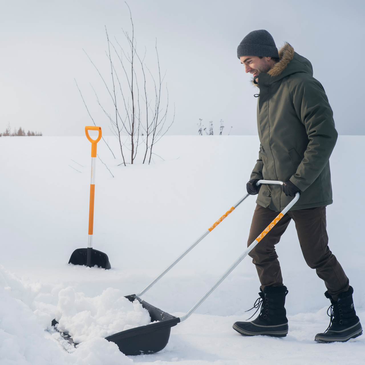 Denne snørydderen fra Fiskars er spesielt utviklet for effektiv snørydding i mindre innkjørsler, parkeringsplasser og lignende områder.