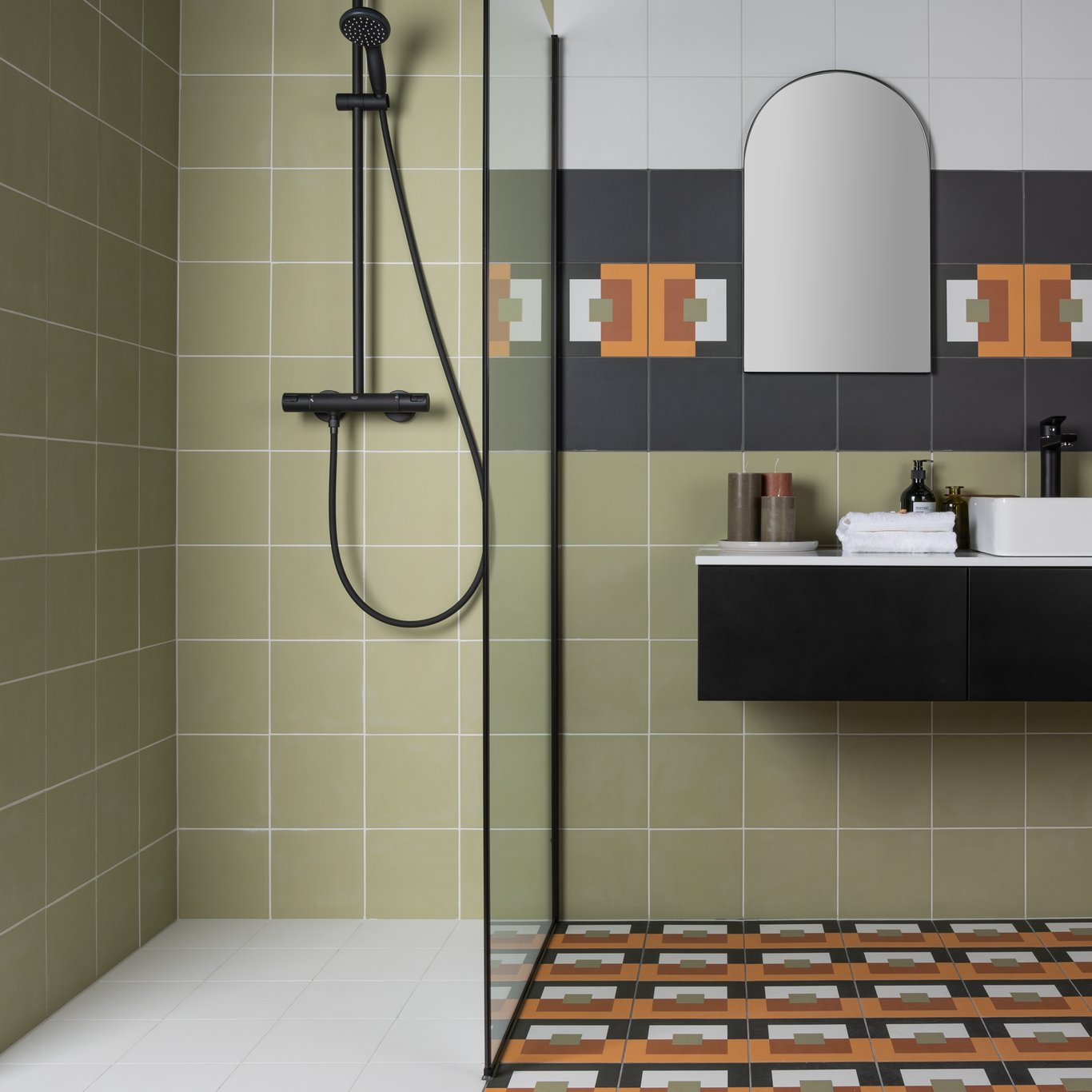 Skap et eget uttrykk på badet eller kjøkkenet ved å kombinere den grønne flisen med de andre fargene og dekorflisene i serien. Den kan for eksempel kombineres med dekorflisen Blatt Warm eller Punkt Cold, og fargene rose, sort og mer.