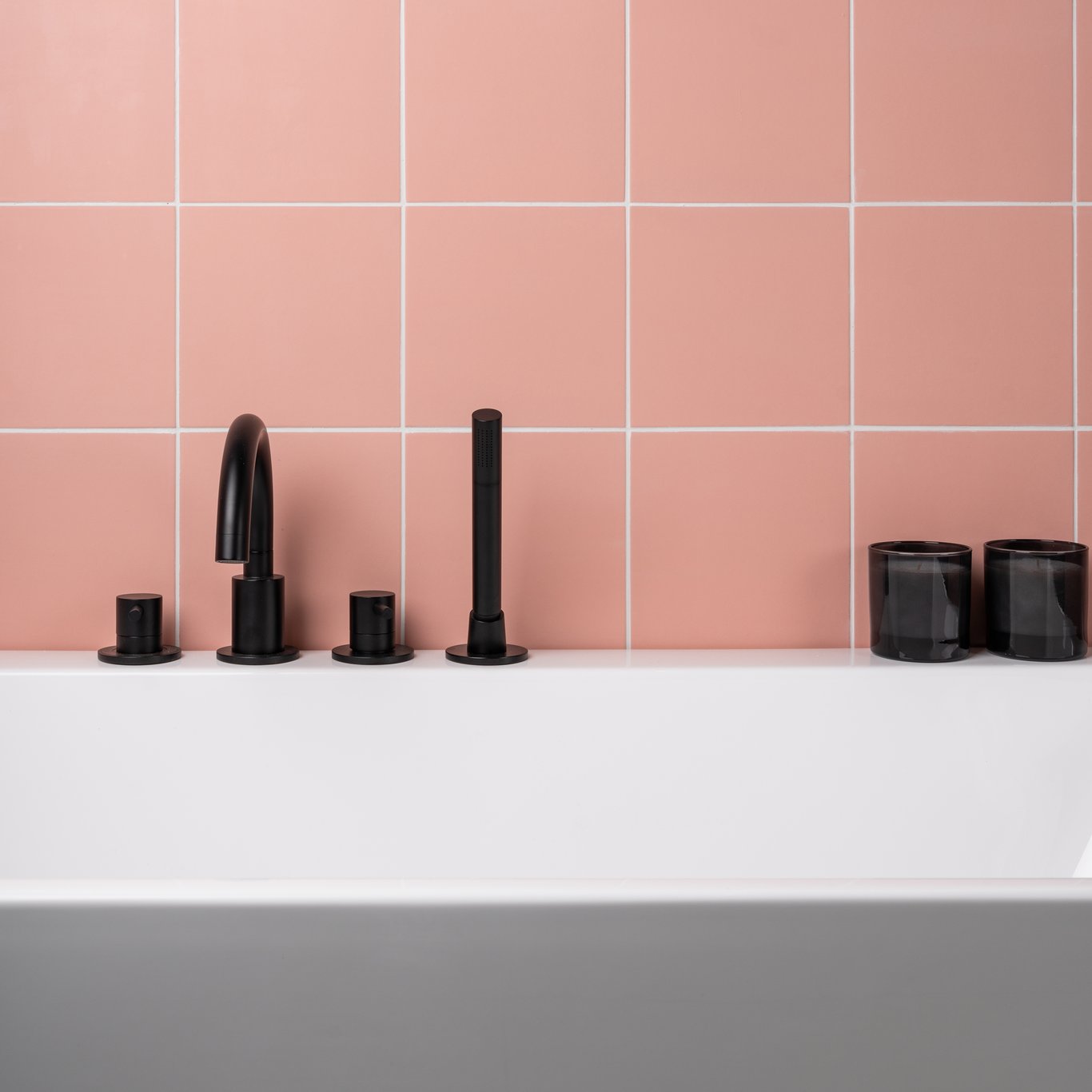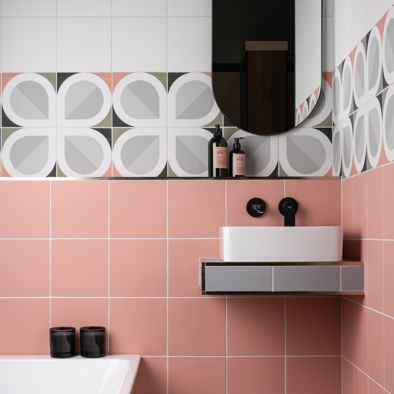 Skap et eget uttrykk på badet eller kjøkkenet ved å kombinere den rosa flisen med de andre fargene og dekorflisene i serien. Den kan for eksempel kombineres med dekorflisen Blatt Cold, og fargene grønn, sort, hvit og mer.