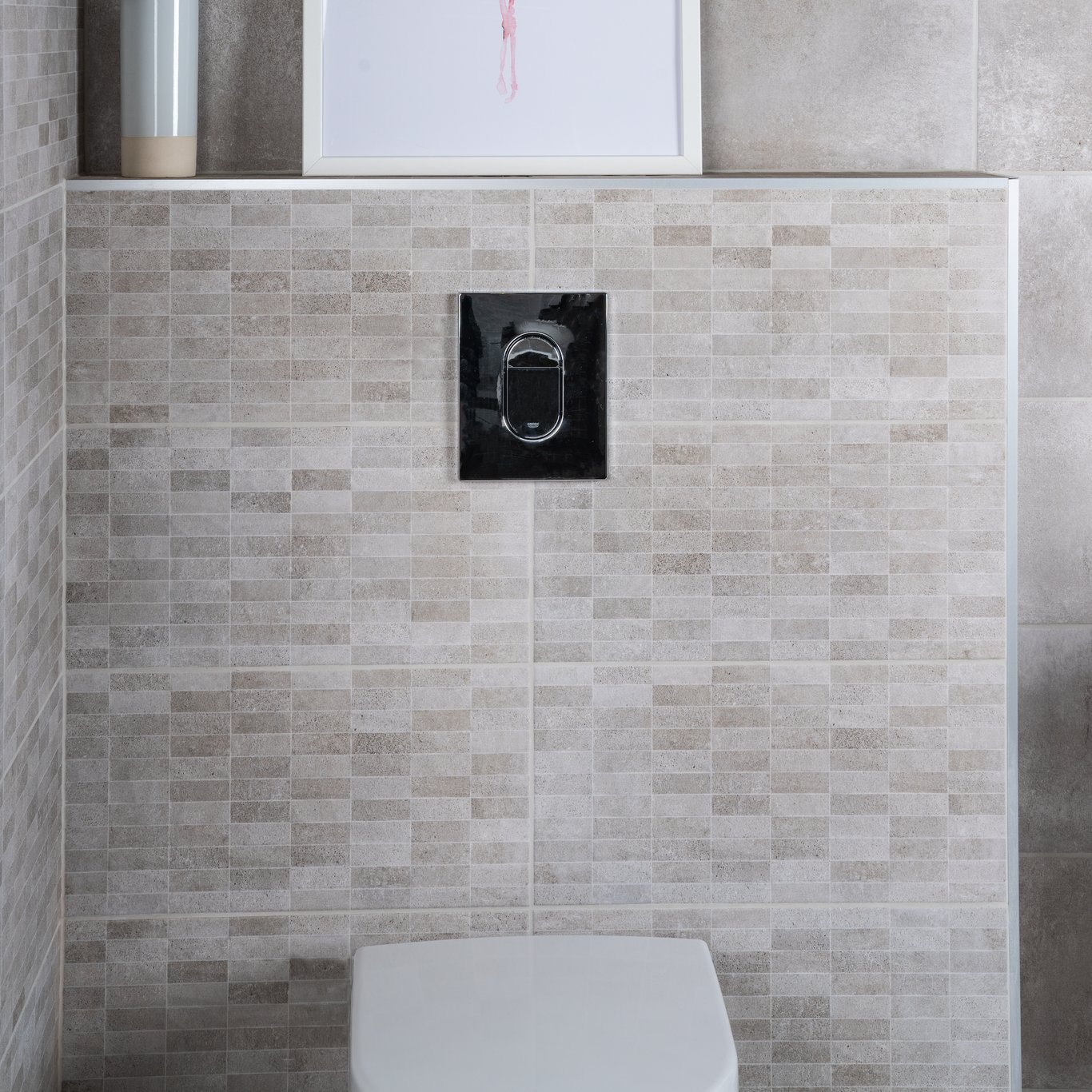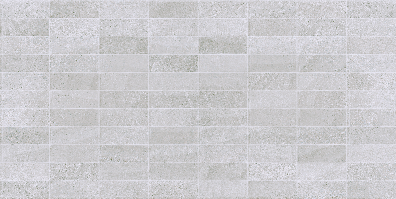 Relieve Beton Grey er en lys og moderne veggflis i størrelse 25x50 cm med flere mindre flis. Flisen er meget slitesterk med en ru og halvmatt overflate med forskjellige gråtoner.