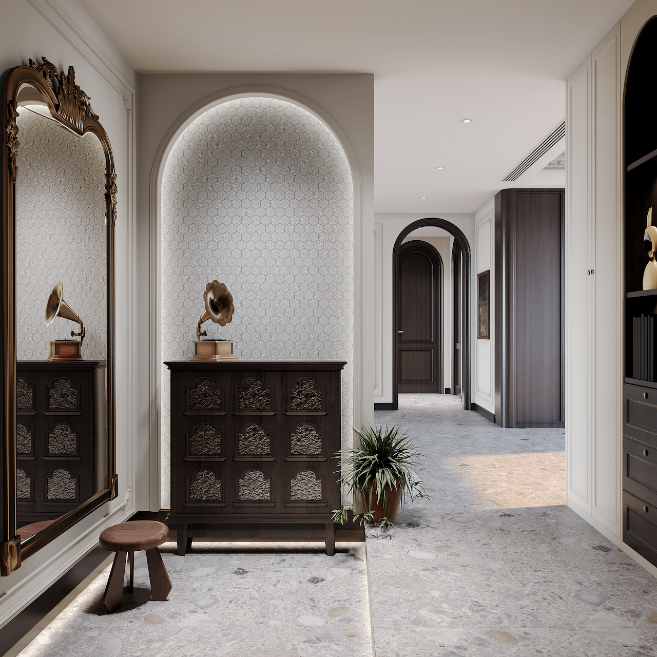 Terrazzo Antico er en terrazzo-inspirert porcellanatoflis i størrelse 60 x 120. Den har en beige hovedfarge, med innslag av sorte og grå spetter.