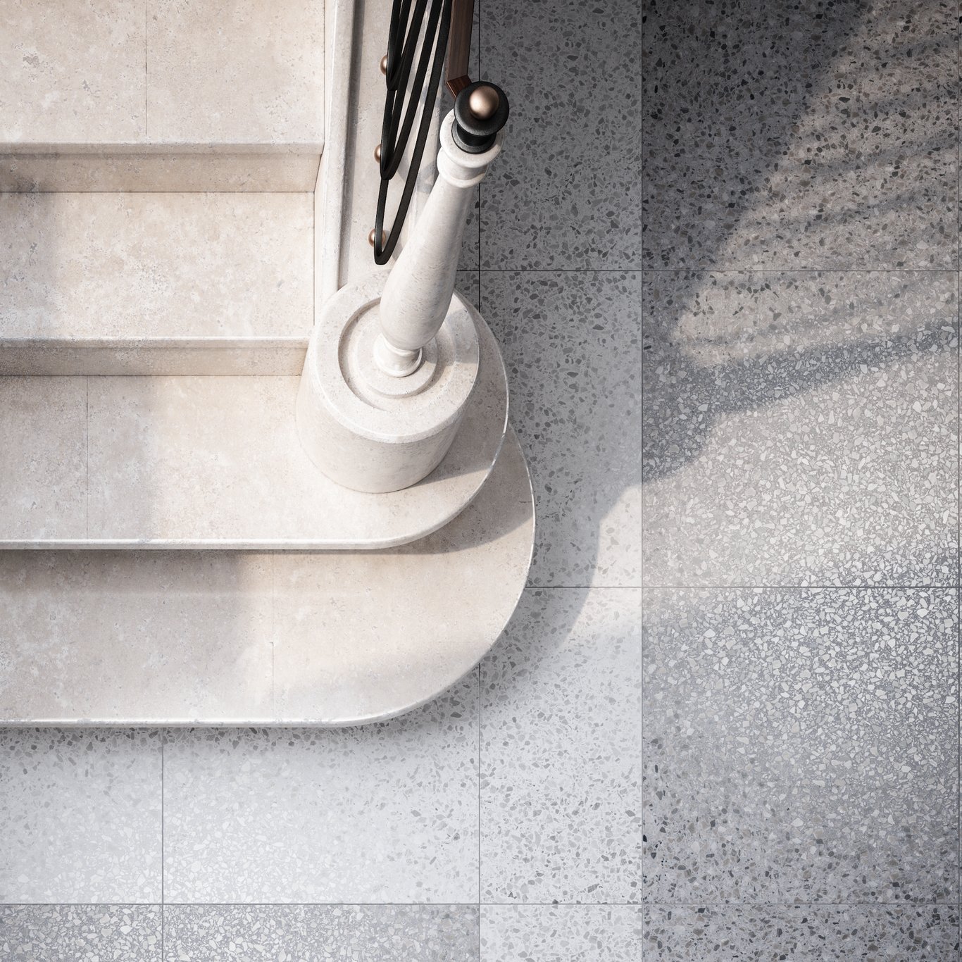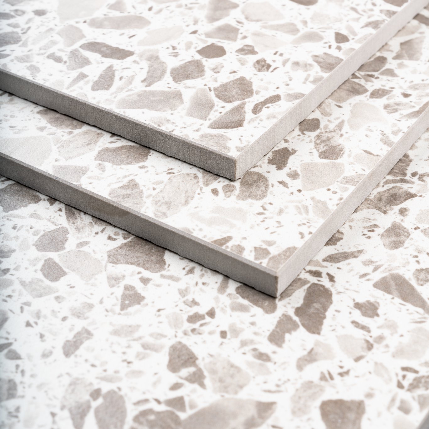 Terrazzo-serien fra italienske Casalgrande Padana har en slitesterk overflate med terrazzo-effekt. Denne flisen i størrelse 60 x 60 har en matt finish.