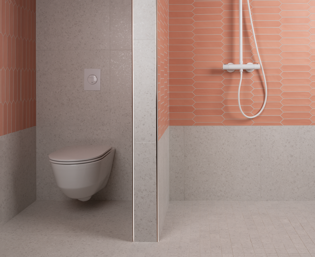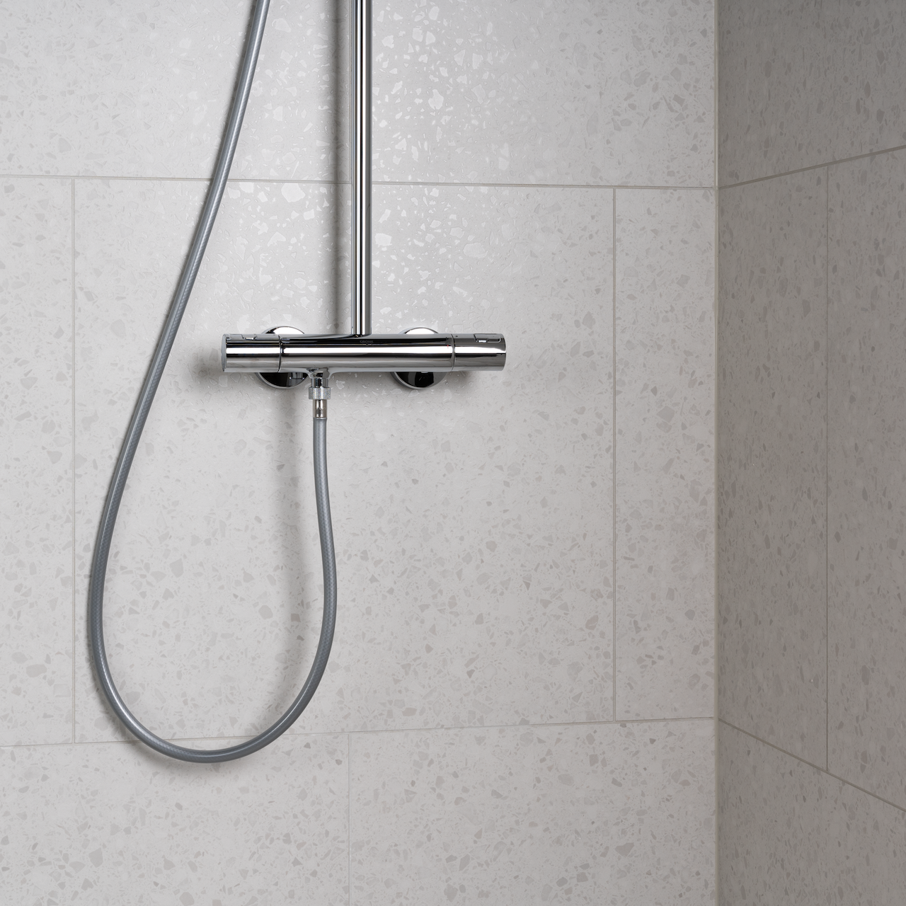 Terrazzo-serien fra italienske Casalgrande Padana har en slitesterk overflate med terrazzo-effekt. Denne flisen i størrelse 60 x 60 har en matt finish.
