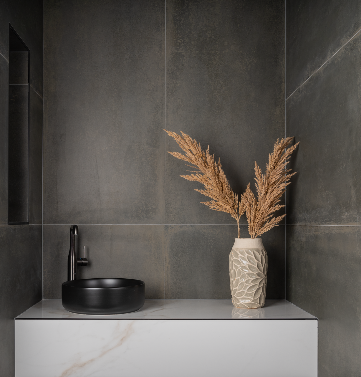 Flisen kan kombineres med både mørke og lyse toner, og ulike elementer for enten et moderne eller et mer rustikk utrykk. Den har en farget porcellanato-kjerne, en overflate med middels høy ripefasthet, og er egnet til gulv og vegg både innen- og utendørs.
