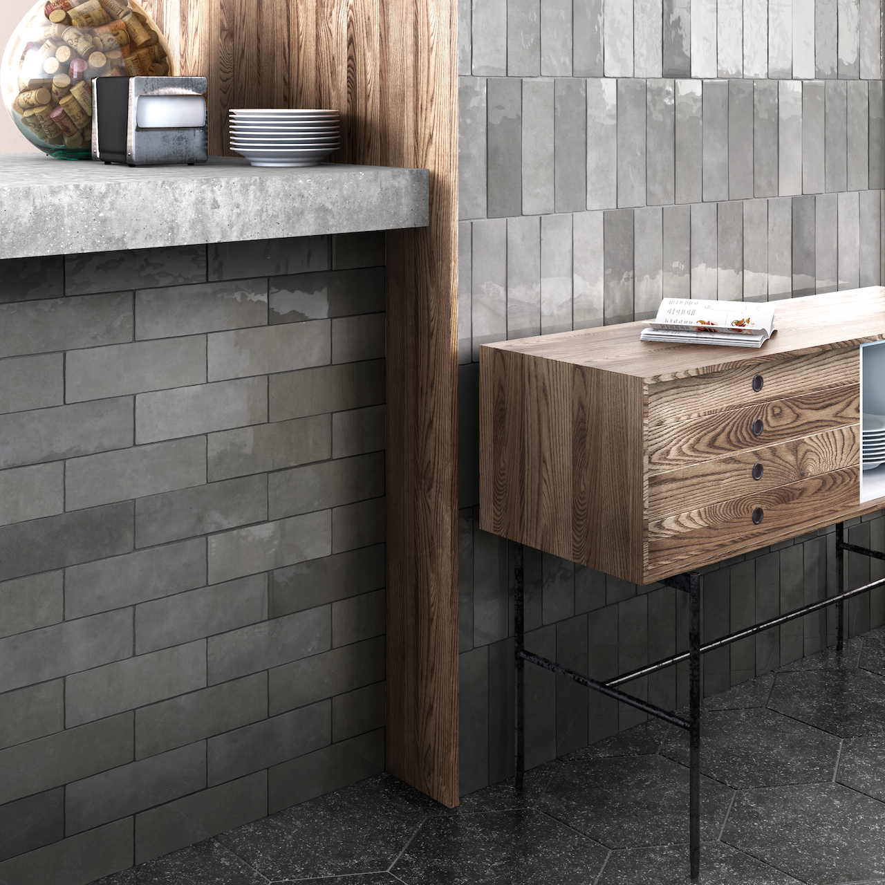 Artisan er en moderne keramisk flis i størrelse 6,5x20 cm. Overflaten er grå og blank, med en bølgete og glatt struktur. Flisen egner seg godt på kjøkken eller som veggflis på bad.