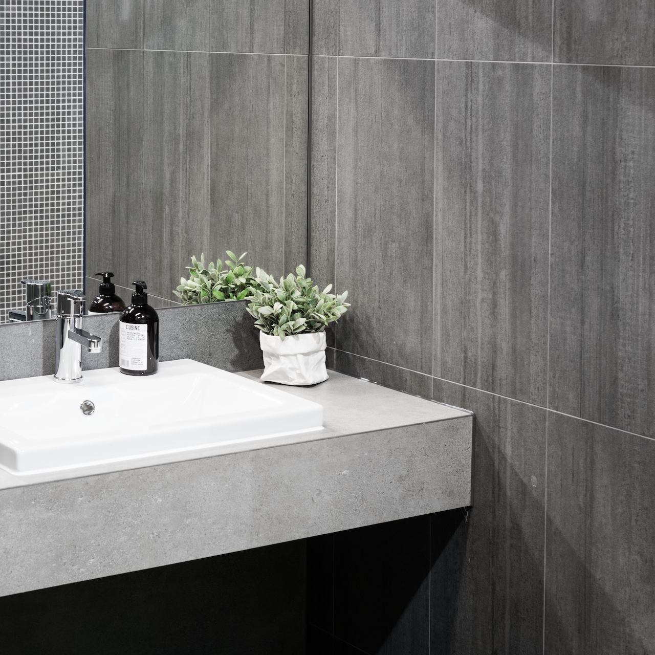 Flisen har et moderne format med mål på 30x60. Overflaten er slett, halvmatt med en imitasjon av betongstruktur i flisens lengderetning, i ulike gråtoner på en koksgrå flate. Helheten vil gi en spennende og trendy flate som egner seg godt i kombinasjon med de fleste farger.