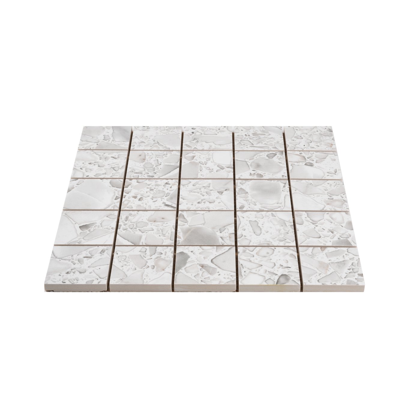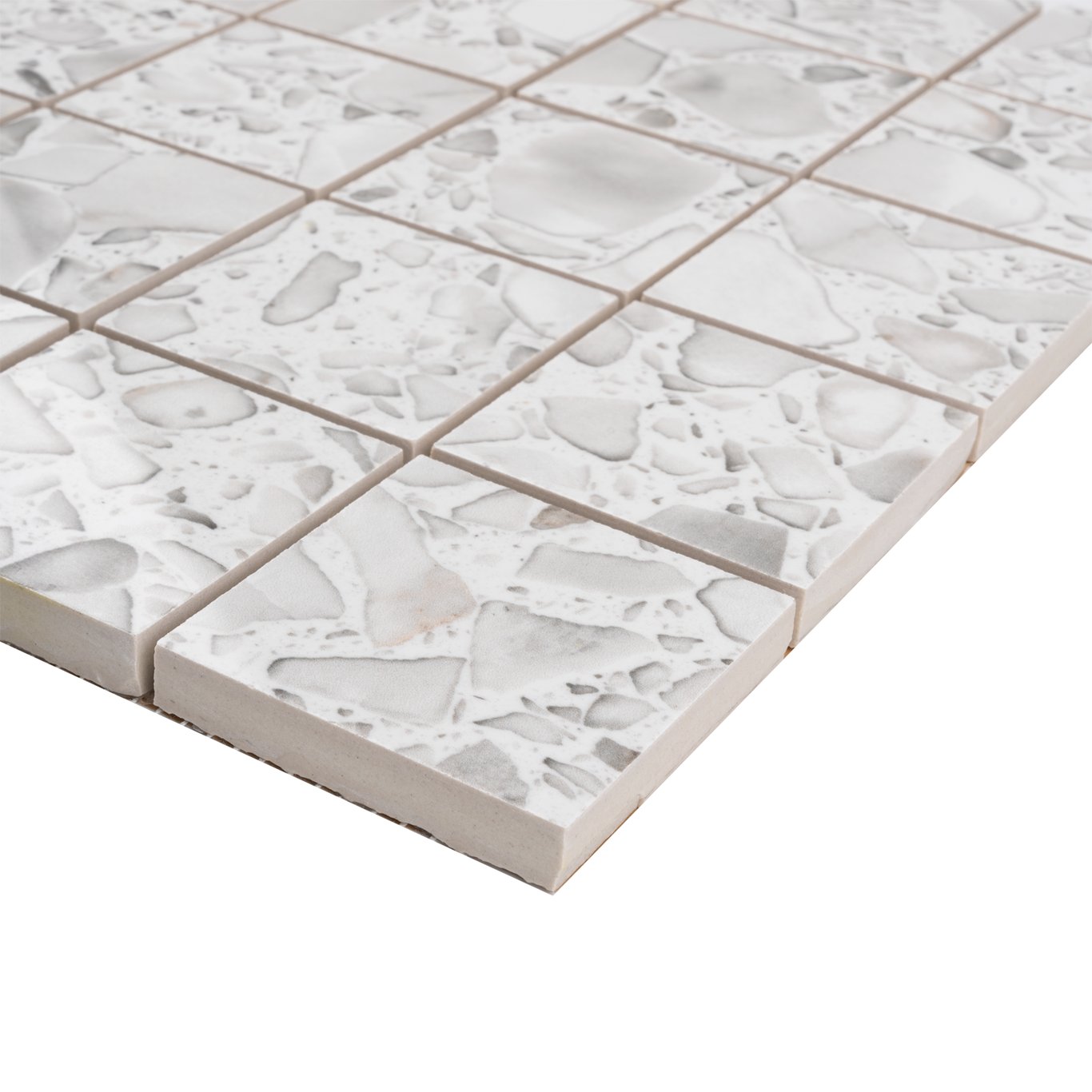 Macro-serien fra italienske Casalgrande Padana har en slitesterk overflate med terrazzo-effekt. Denne mosaikken i størrelse 6 x 6 har en polert overflate med en naturlig finish.