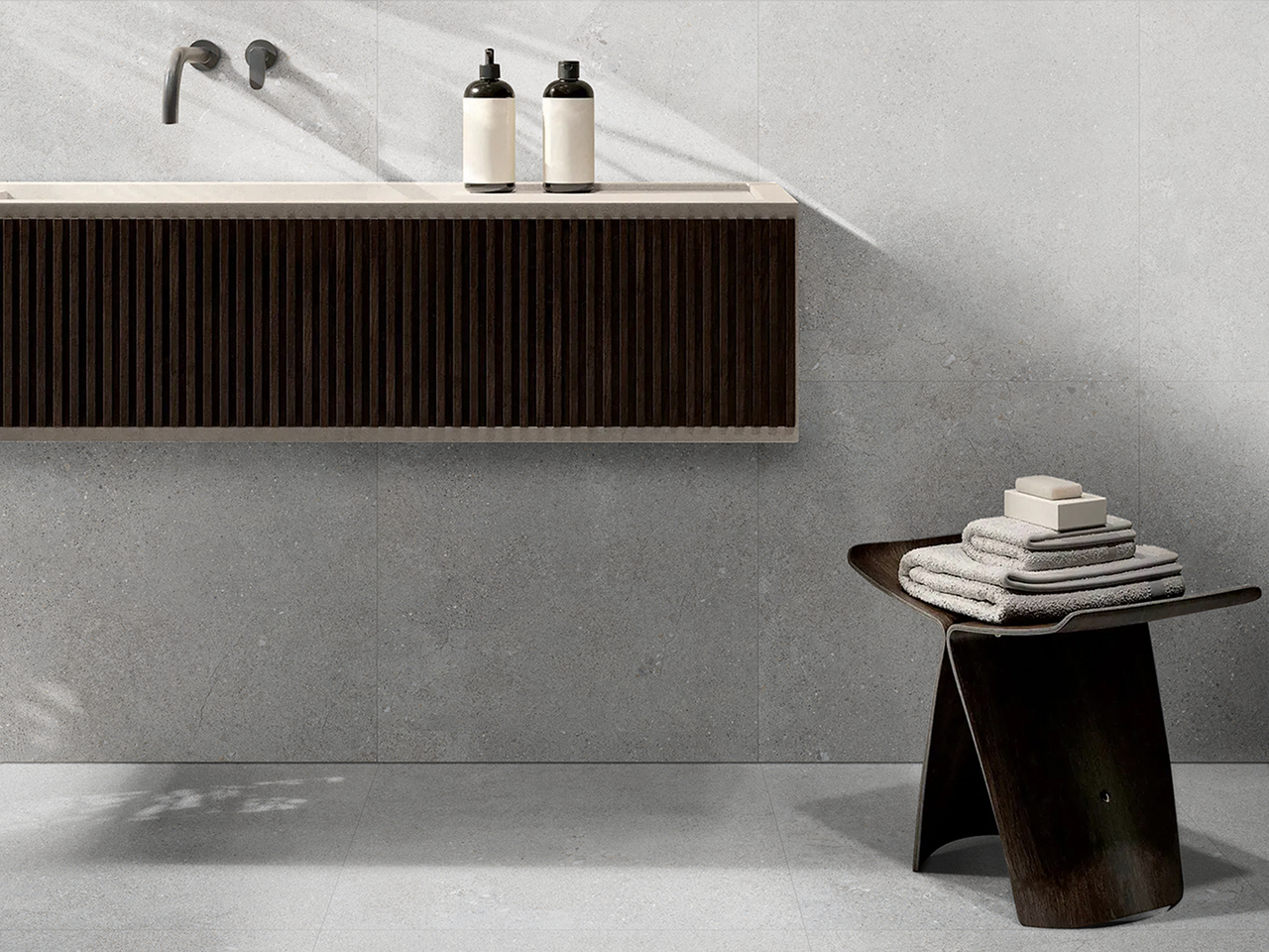 Overflaten har en lett ujevn, matt finish med et stilfullt steinstrukturdesign. Saulo kommer i fargene Bianco, Grigio og Grafite.