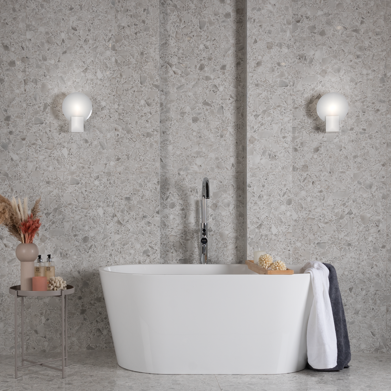 Macro-serien fra italienske Casalgrande Padana har en slitesterk overflate med terrazzo-effekt. Denne storformatflisen i størrelse 60 x 120 har en polert overflate med en naturlig finish.