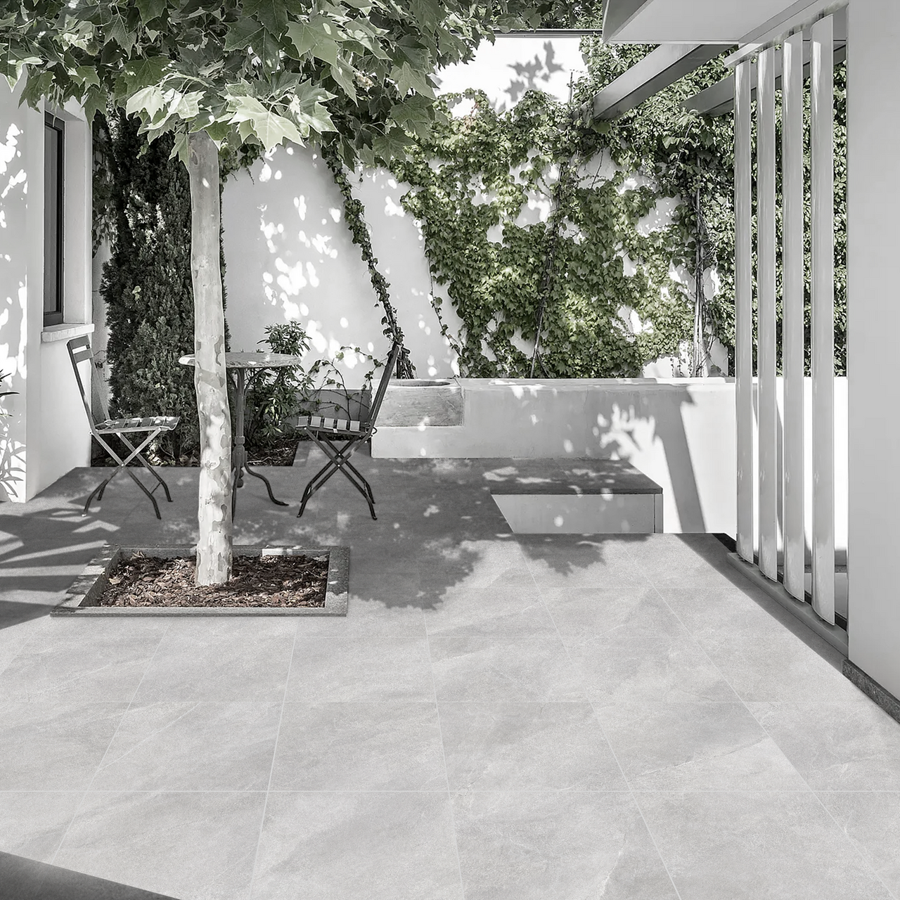 Den matte overflaten med myk struktur gir et naturlig og moderne preg, samtidig som den sikrer godt grep. Med høy slitestyrke og sklisikkerhet er flisen spesielt godt egnet for utendørs bruk.