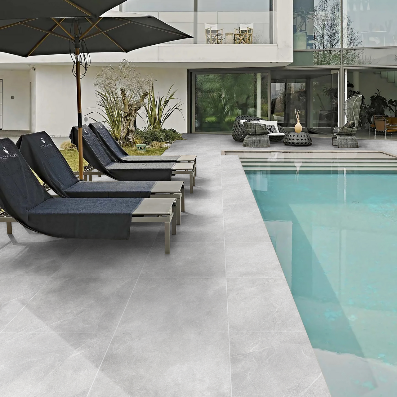 Den matte overflaten med myk struktur gir et naturlig og moderne preg, samtidig som den sikrer godt grep. Med høy slitestyrke og sklisikkerhet er flisen spesielt godt egnet for utendørs bruk.