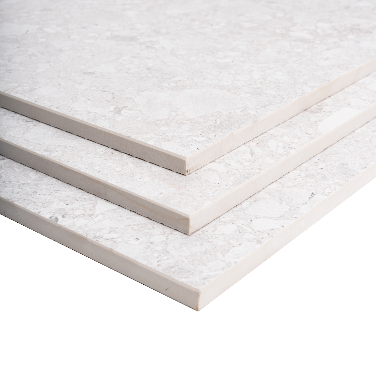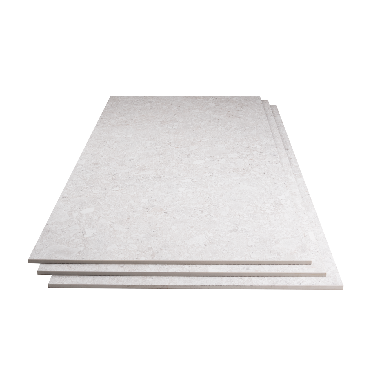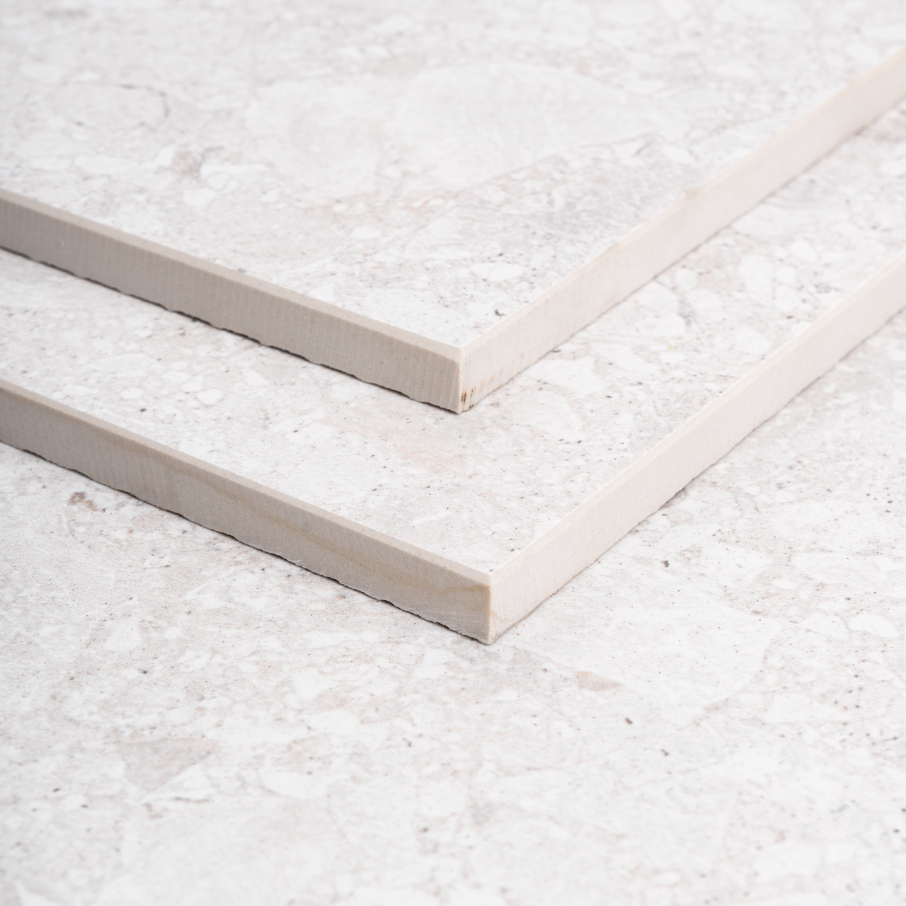 Denne gulvflisen vil gi gulvet ditt et urbant og eksklusivt uttrykk. Ved å benytte en liten fugebredde og fugefarge tilnærmet lik grunnfargen på flisen vil du få en helhetlig overflate som gir inntrykk av å være et helt terrazzo-gulv.