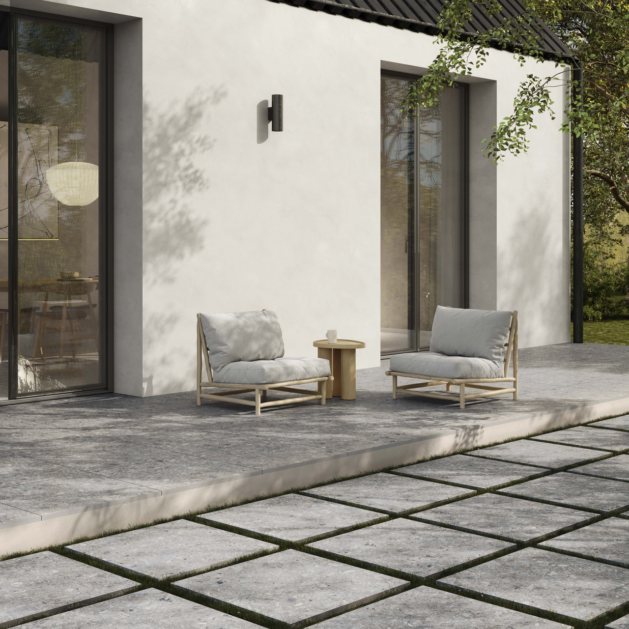 Denne porcellanatoflisen fra italienske Casalgrande Padana egner seg godt til bruk på terrasser eller i hager. Flisene har en grå, sklisikker overflate med terrazzo-imitasjon.