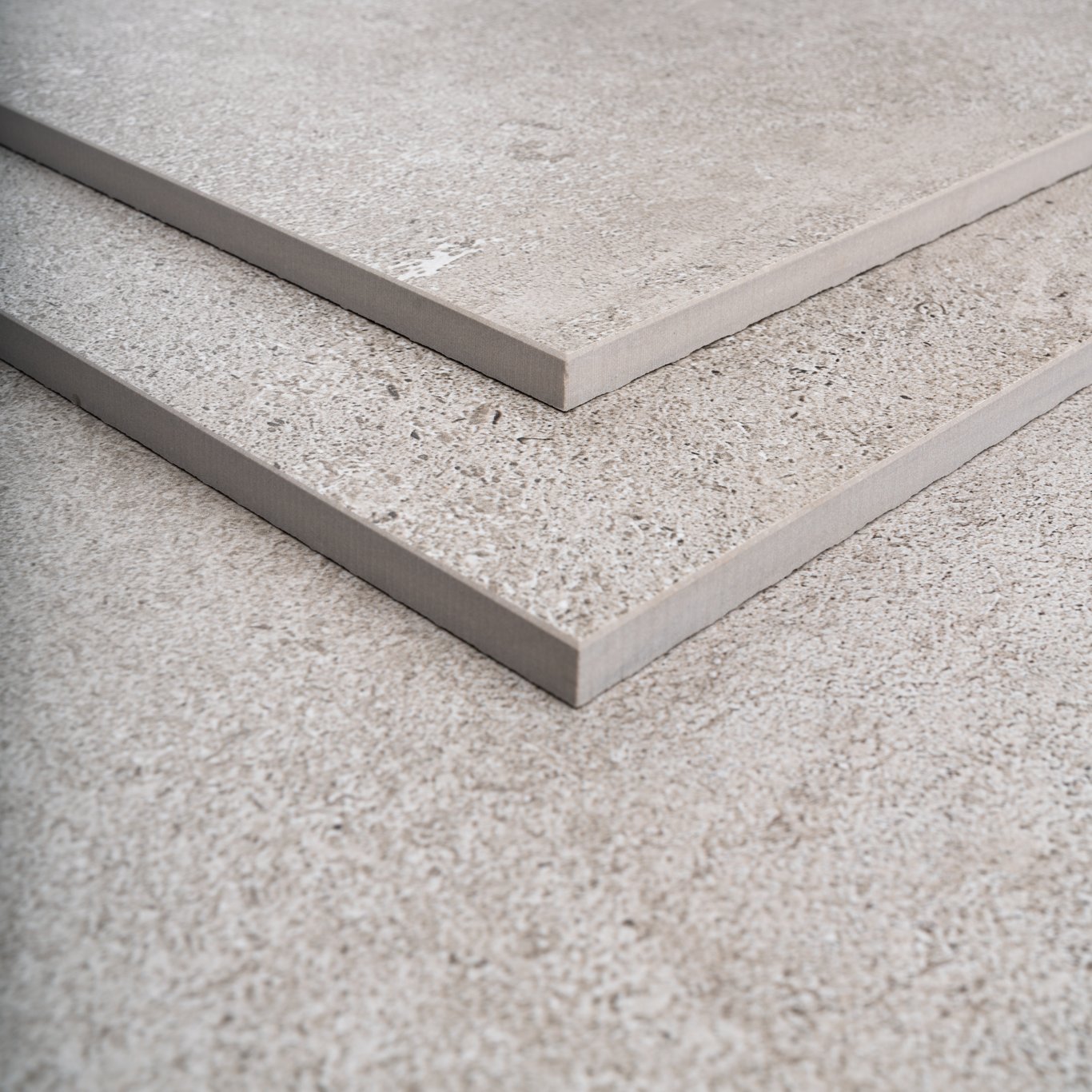 Flisen har et moderne storformat med mål på 60x60. Overflaten er slett, halvmatt med en myk imitasjon av betongstruktur, i nøytrale gråtoner. Helheten vil gi en spennende og trendy flate som egner seg godt i kombinasjon med de fleste farger.