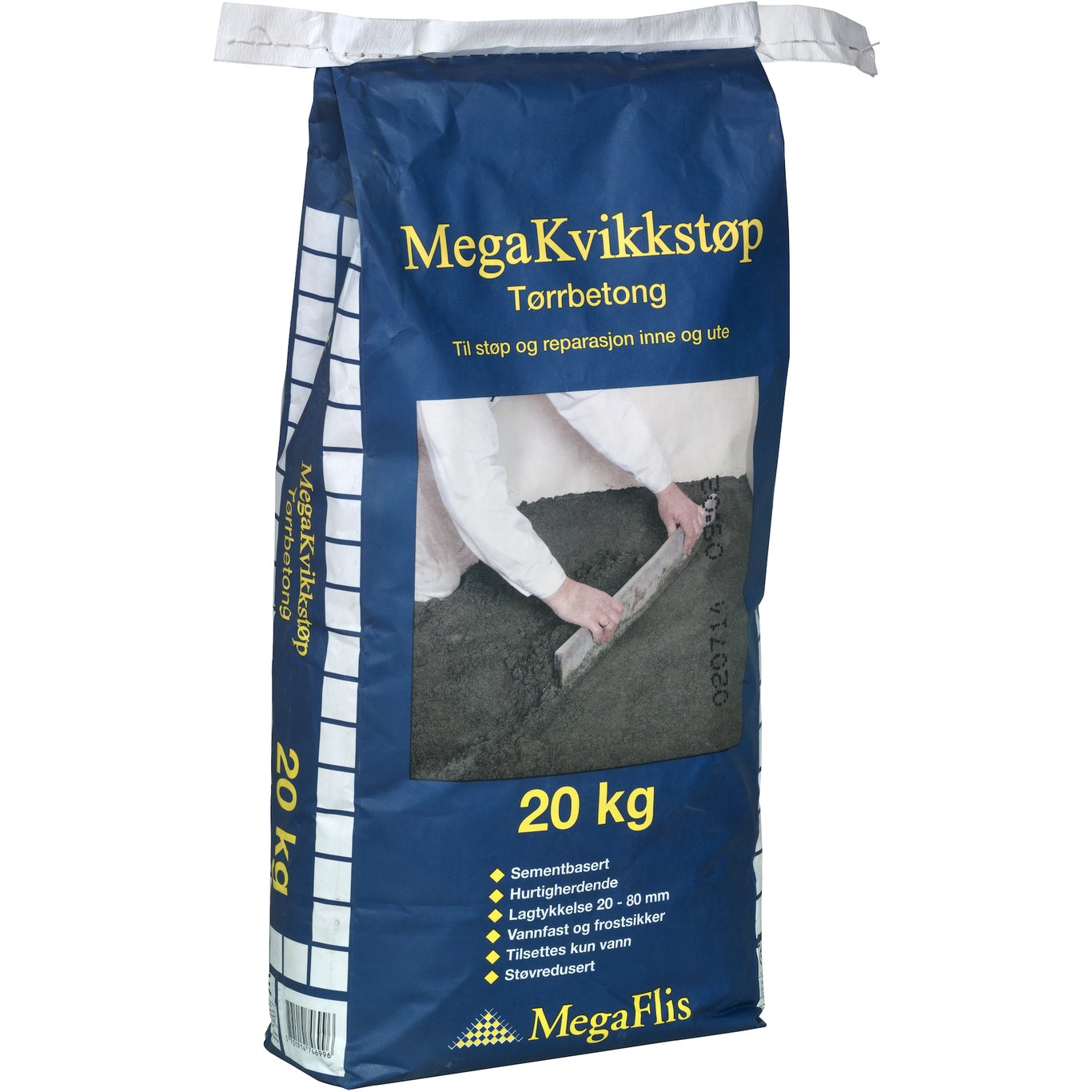 Plastforsterket, hurtigherdende, vannfast og frostsikker tørrbetong. Mega kvikkstøp benyttes til støping av betonggulv/påstøp og flytende gulv. Produktet kan også benyttes til reparasjon av hull og svanker på betong samt forankring av beslag, søyler m.m., i fuktige og tørre områder, ute og inne. Mega Kvikkstøp kan benyttes som fast forankret påstøp på underlag av betong. Mega Kvikkstøp kan benyttes som flytende gulv uten armering på faste underlag med glidelag, eller med armering på markisolasjon med glidelag.