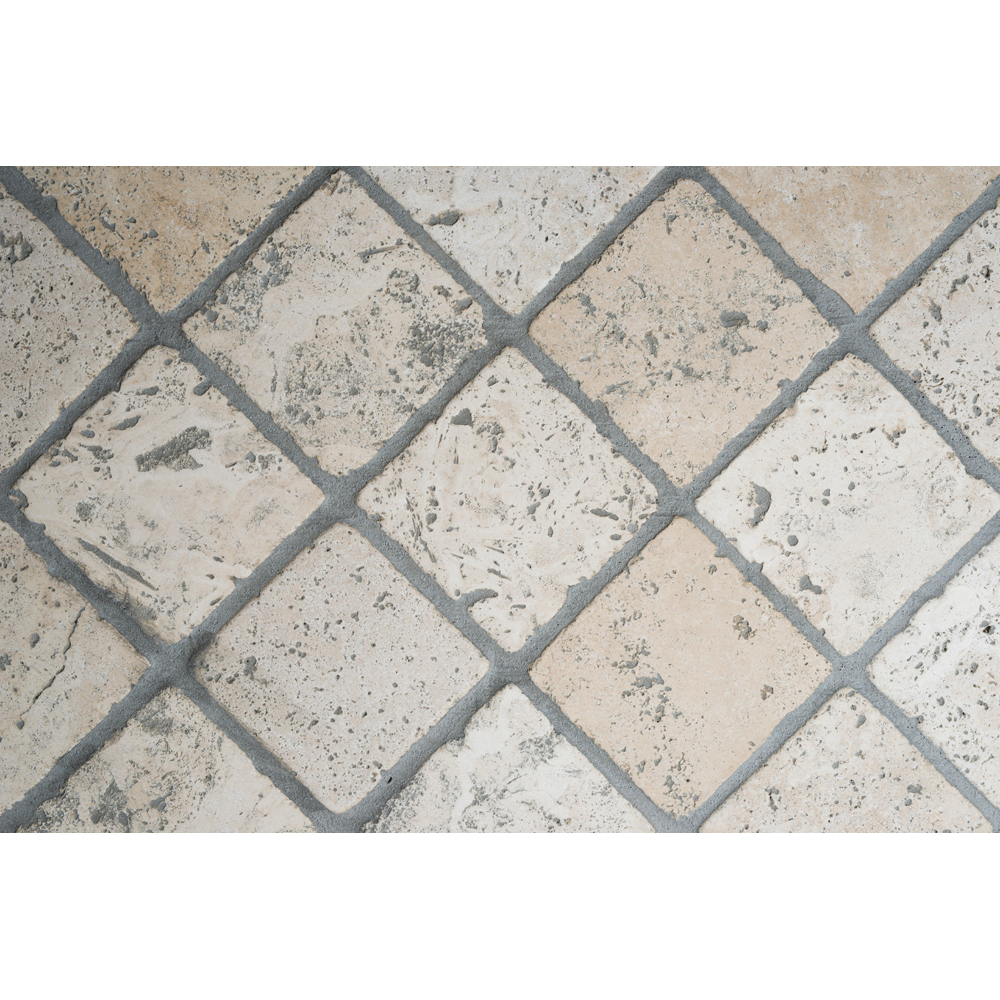 Travertino Chairo er antikk marmor i 10x10 fra Italia. Flisen har en noe ujevn halvmatt overflate med tydelige porer og et marmorert fargespill av varme beigetoner, på en lys beige flate.