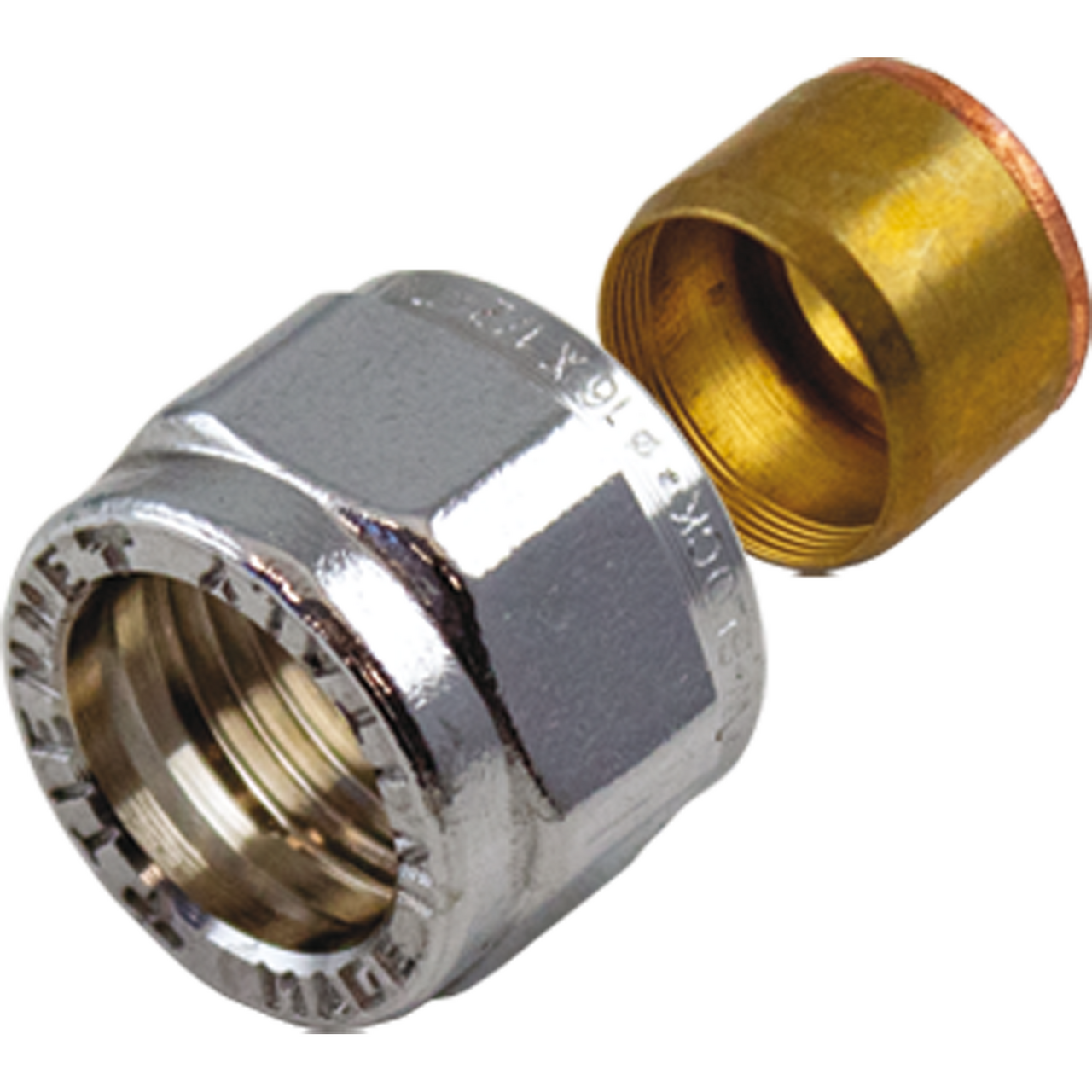 Kobling i messing. For innfesting av kobberrør mot flatt og konisk gods.