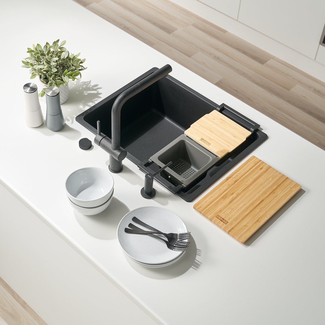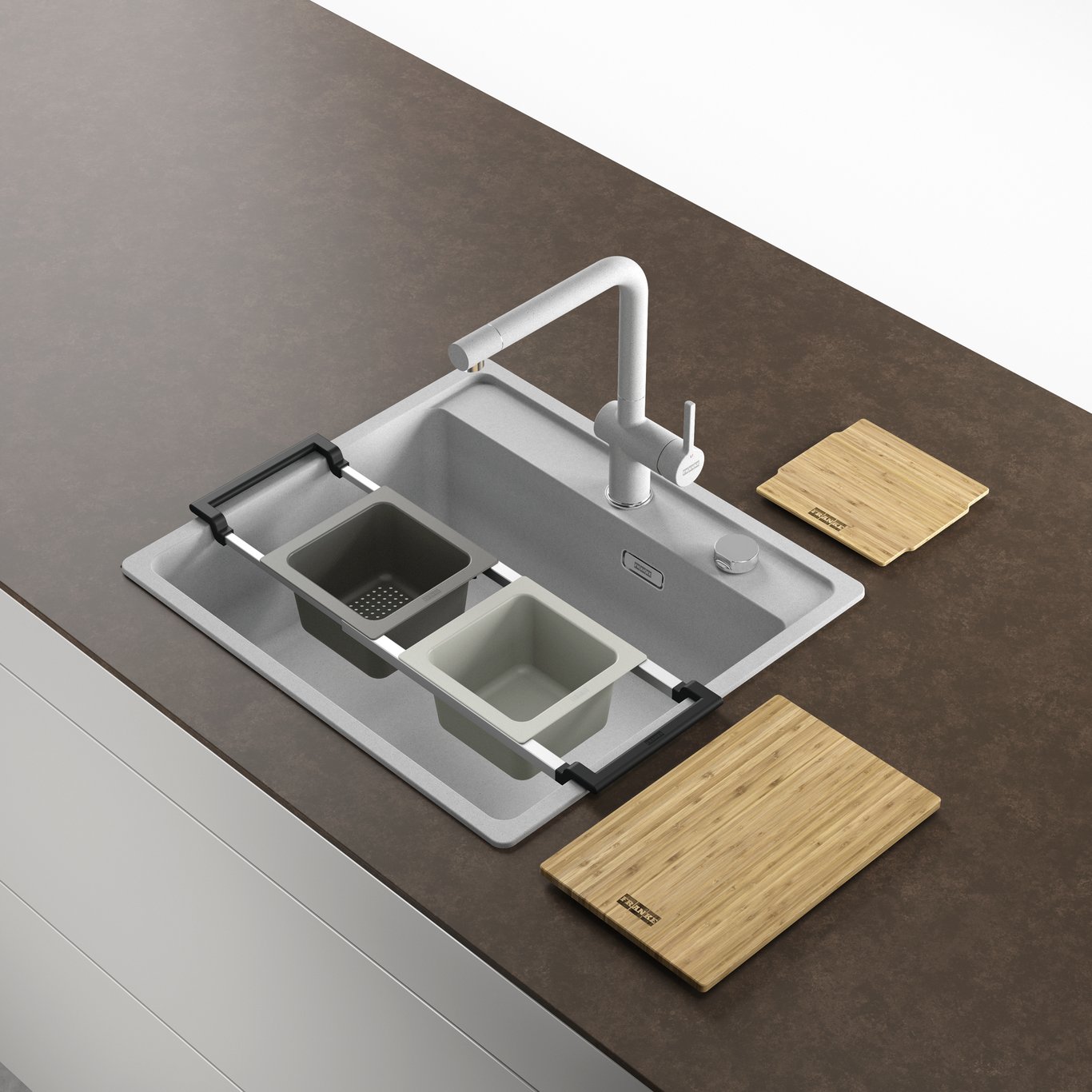 Franke All-in set er et stilig og funksjonelt tilbehør som hjelper deg med en rekke oppgaver på kjøkkenet, inkludert matlaging og rengjøring. Kompatibelt med alle vasker opp til 540 mm.