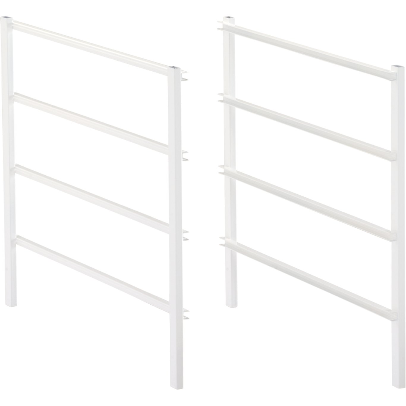 Denne 4-skinners gavelsiden fra Elfa monteres sammen med tverrstag og kurver for en komplett løsning. Med et påbygningssett kan du enkelt stable flere enheter på hverandre. Du kan også legge til en topphylle for å lage en arbeidsflate.