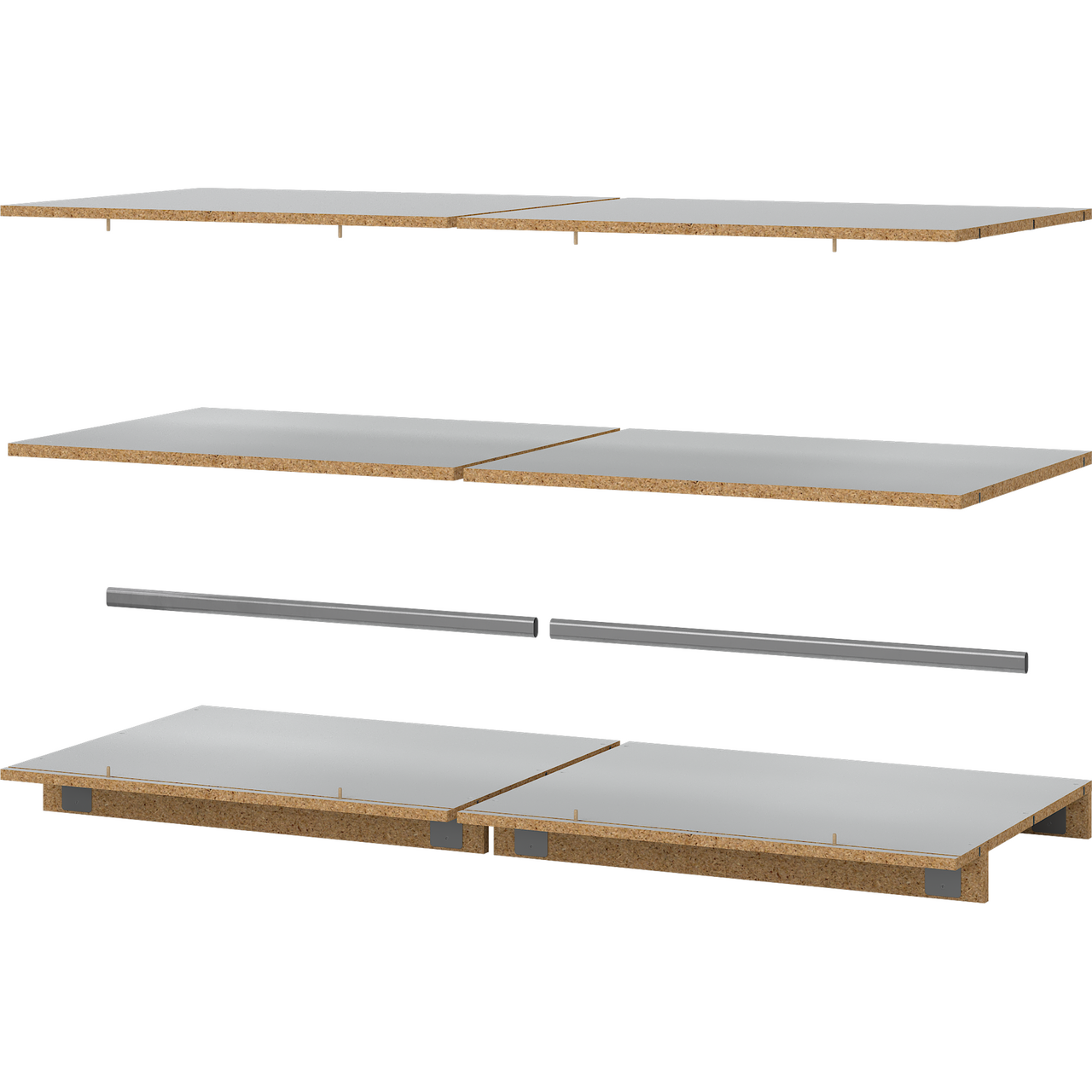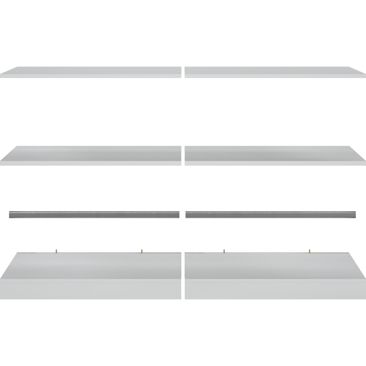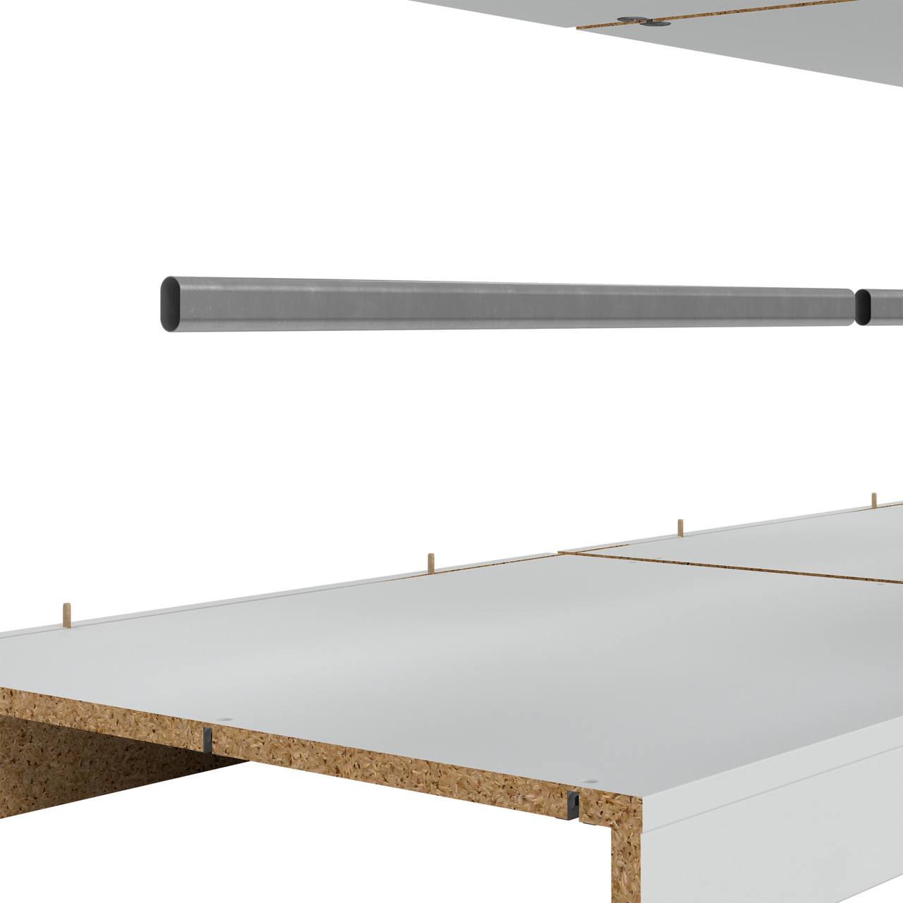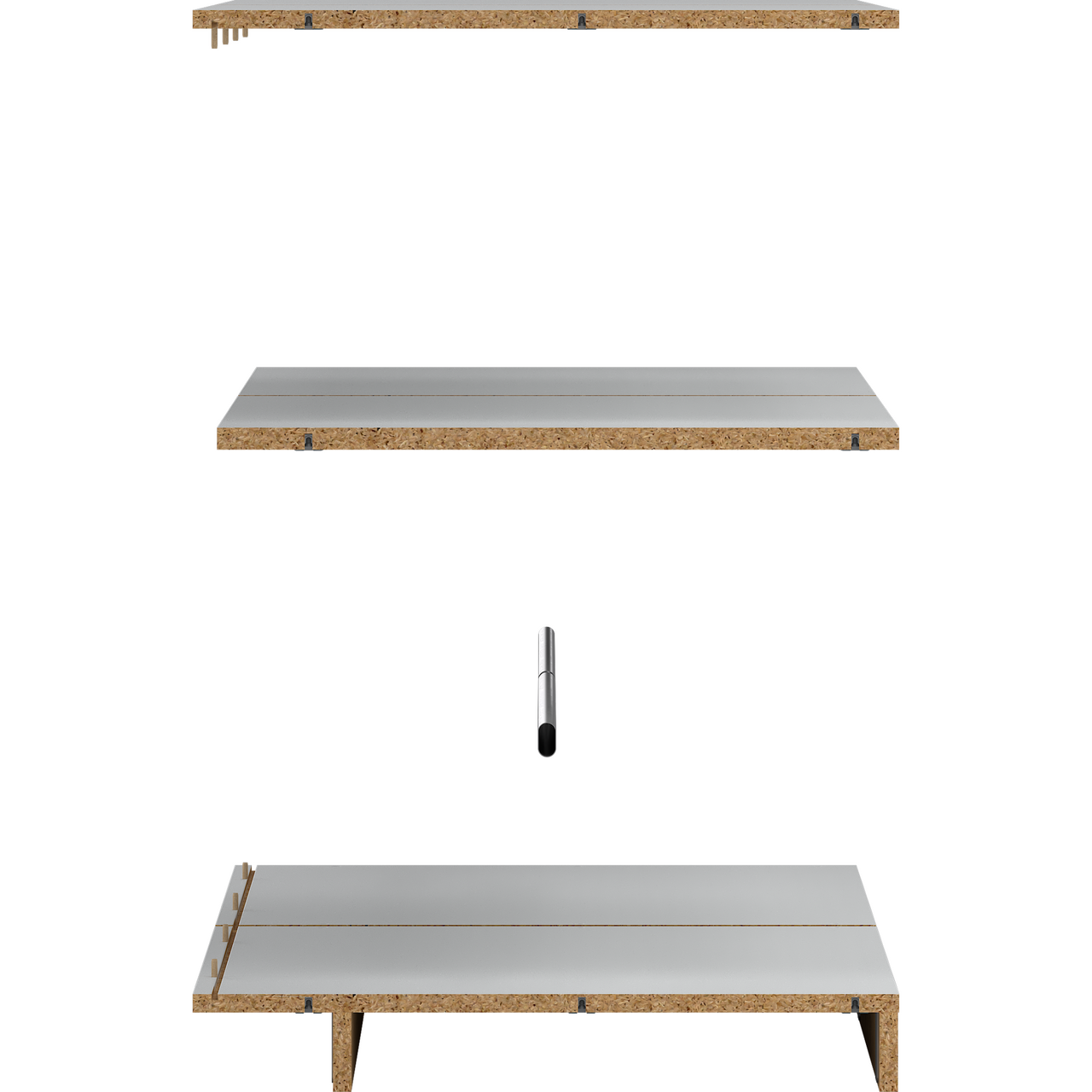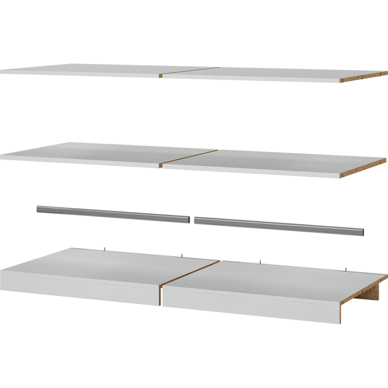 Grunnmodul til Lind Nest garderobeløsning som inneholder topp, bunn, hylle, sokkel og stang.