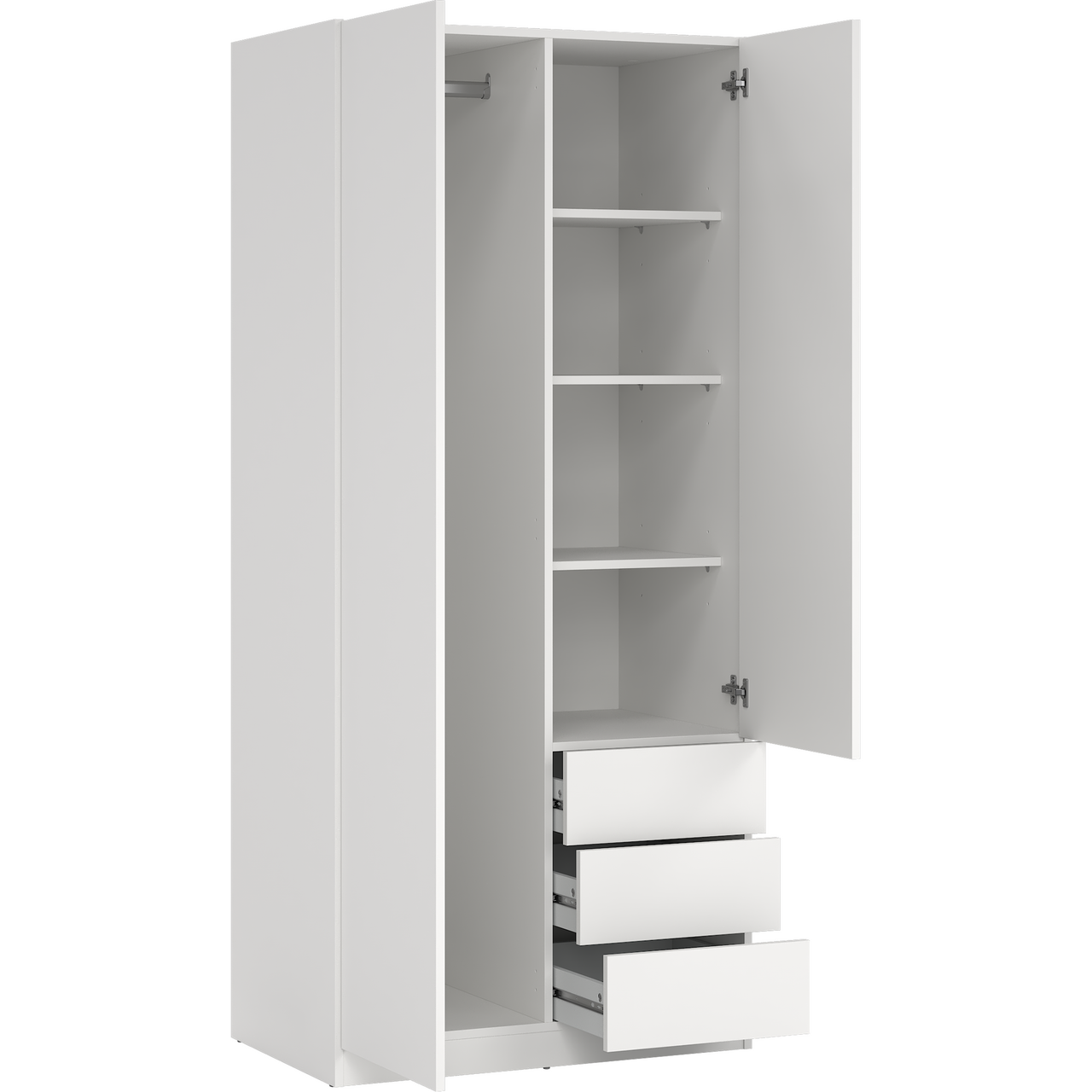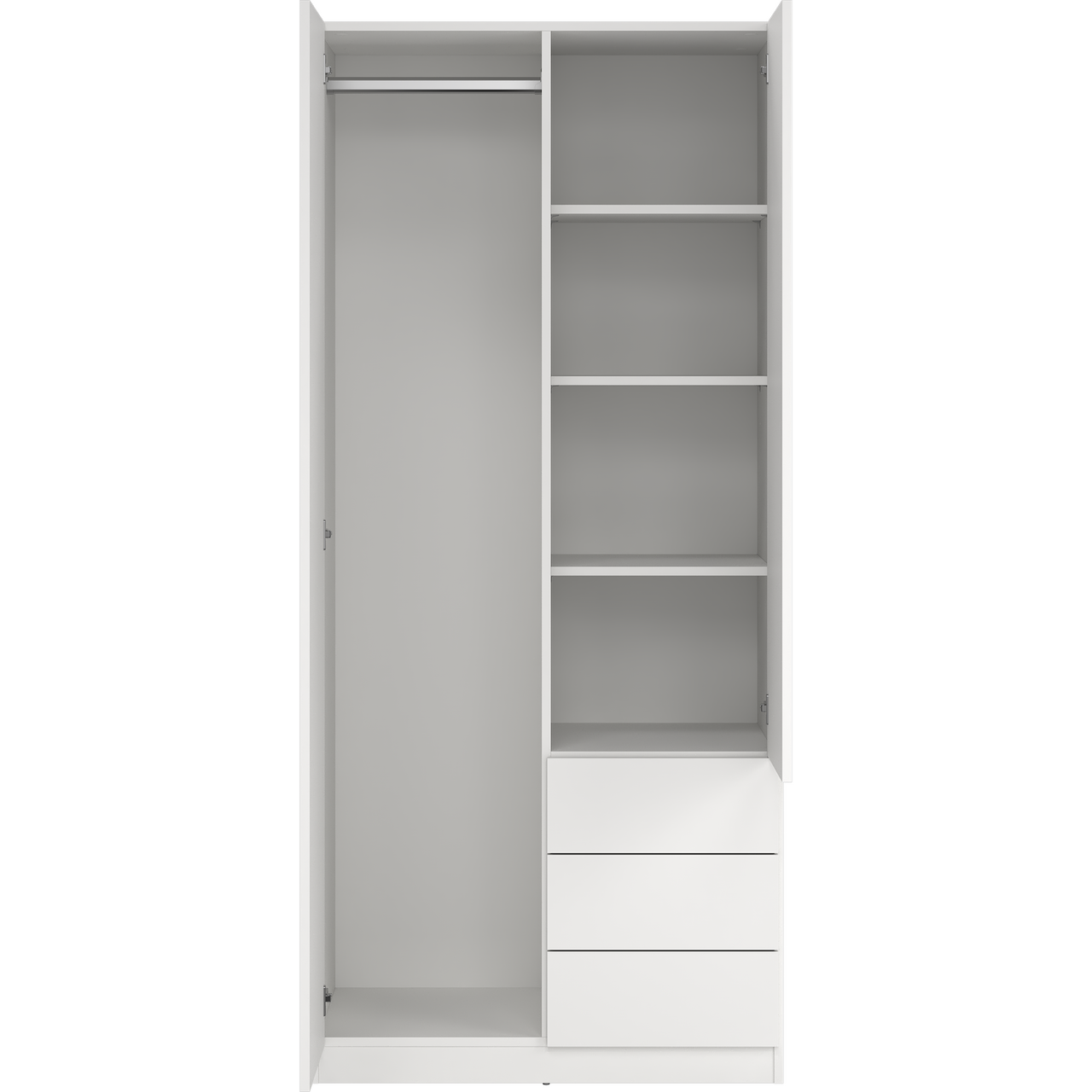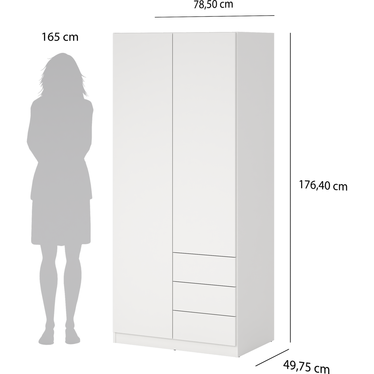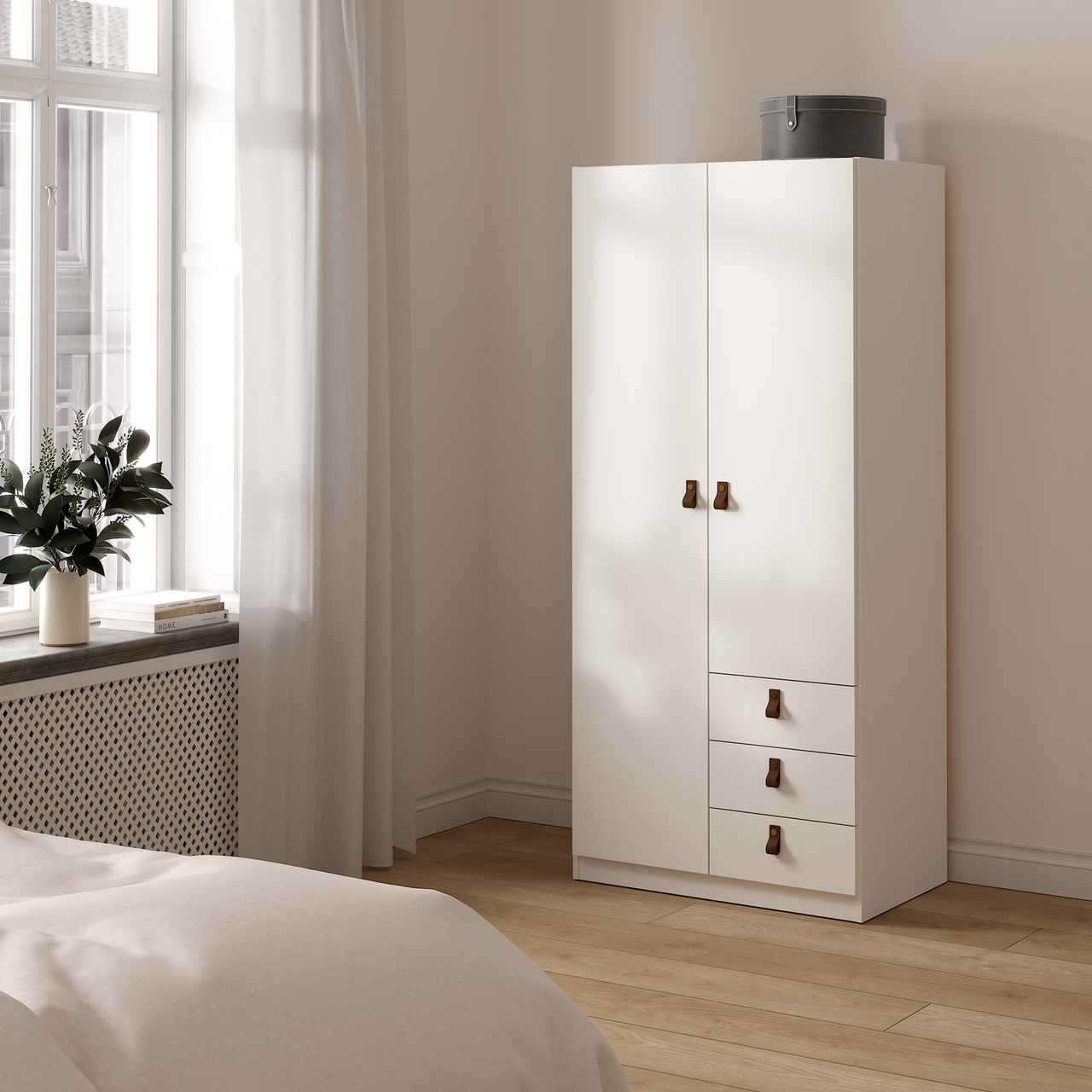 Skapet har to dører og har funksjonell oppbevaring med tre justerbare hyller, én fast hylle og en praktisk klesstang for ryddig organisering av klær. I tillegg sørger tre romslige skuffer for ekstra lagringsplass.