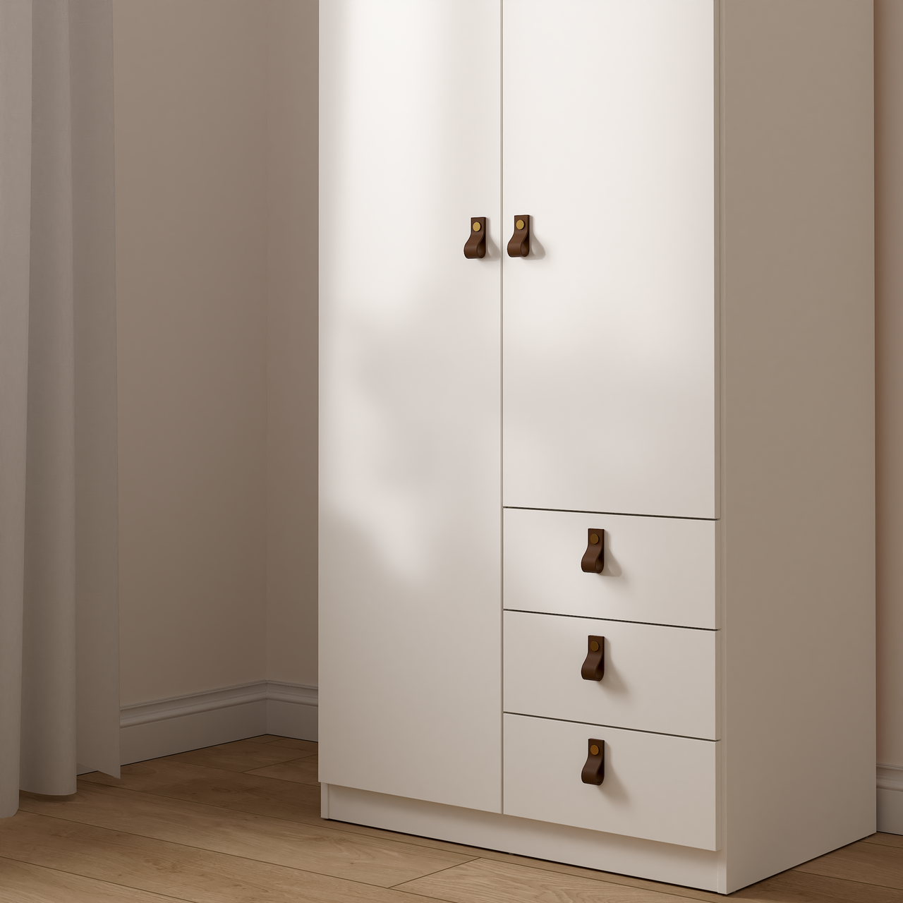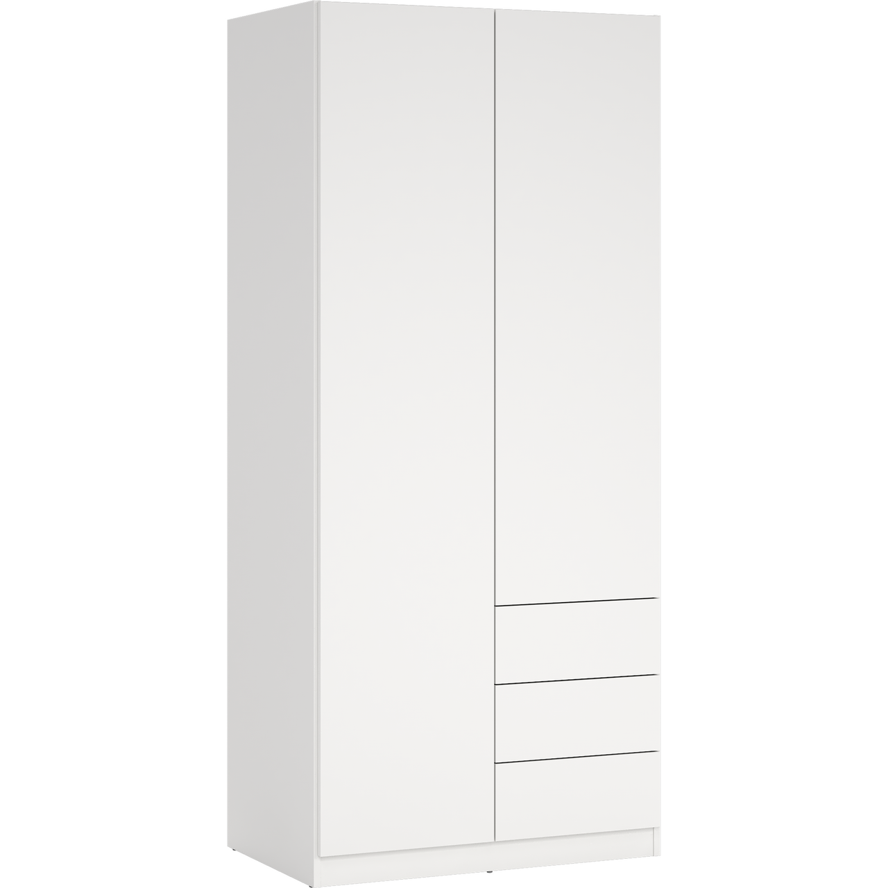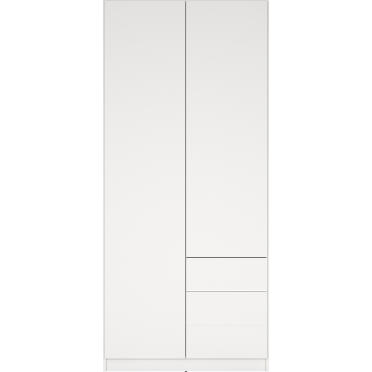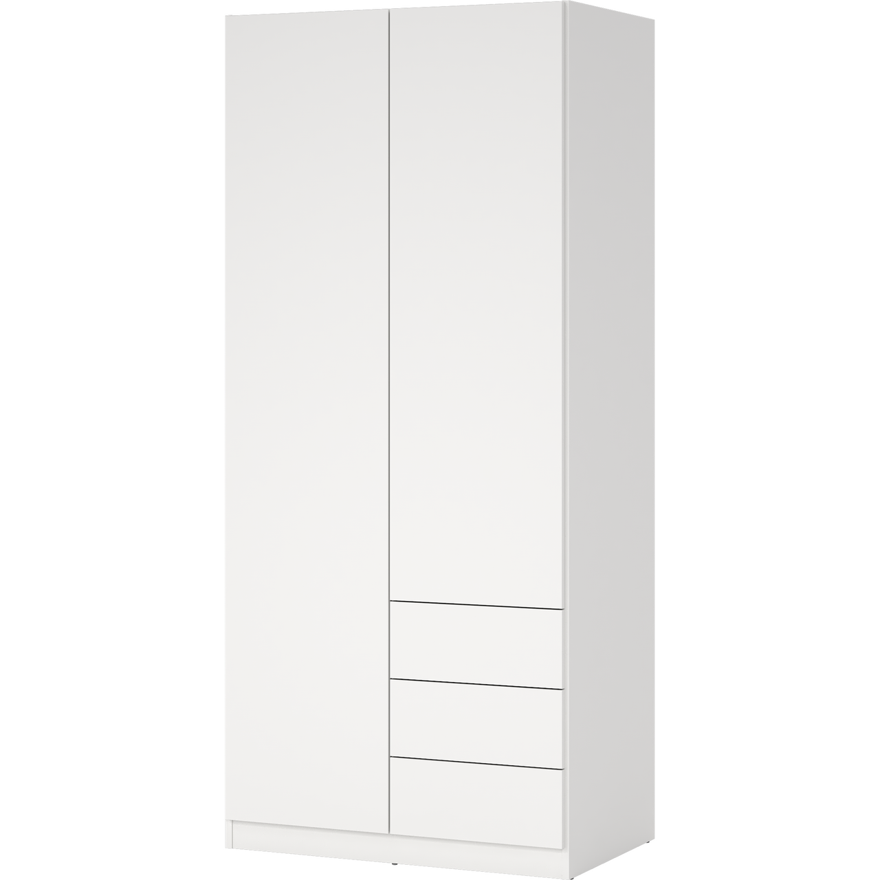 Skapet har to dører og har funksjonell oppbevaring med tre justerbare hyller, én fast hylle og en praktisk klesstang for ryddig organisering av klær. I tillegg sørger tre romslige skuffer for ekstra lagringsplass.