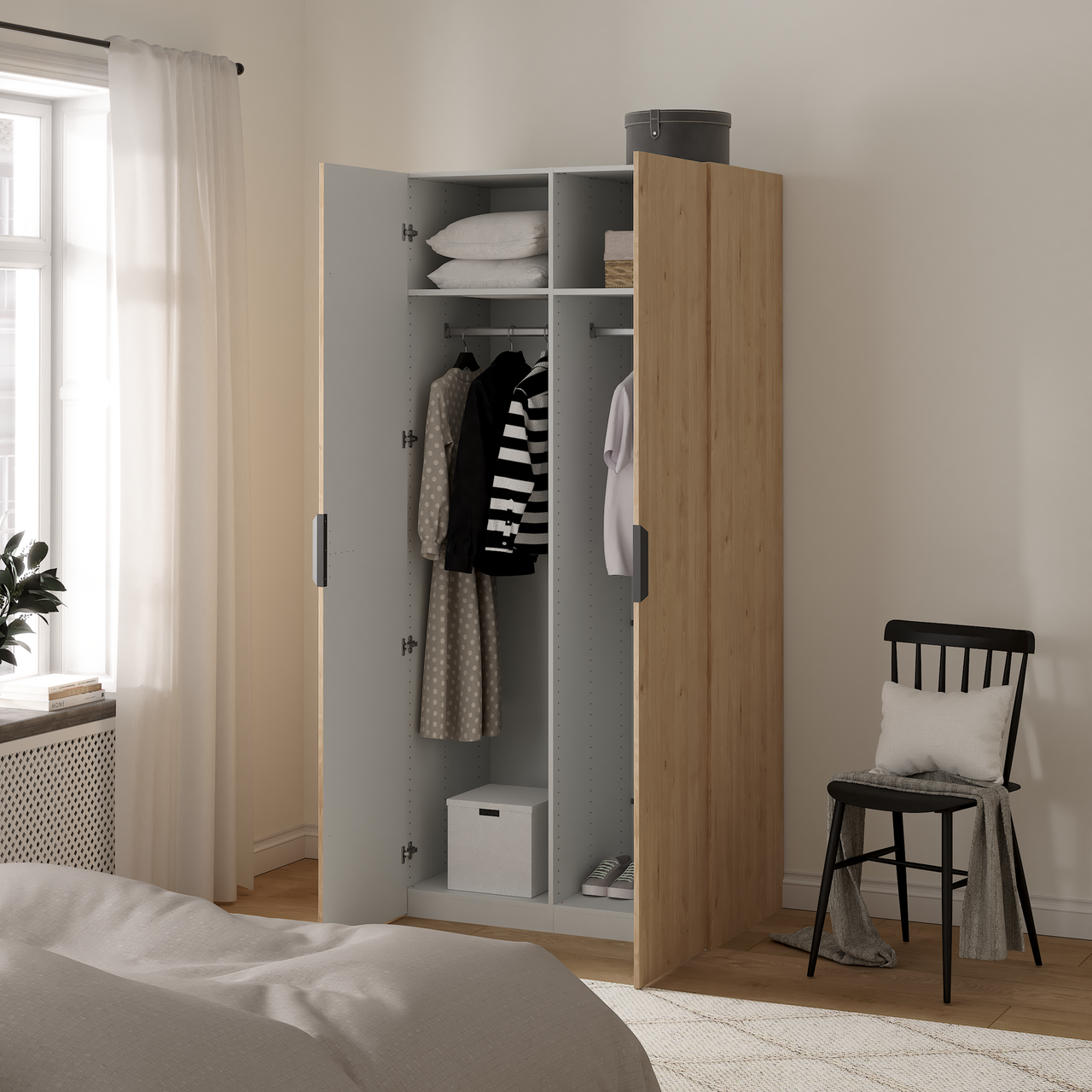 Lind Nest er en fleksibel garderobeløsning der man kan tilpasse garderoben akkurat slik man ønsker. Enten man vil ha det stilrent og minimalistisk eller fullt av smarte oppbevaringsløsninger, tilbyr Lind Nest friheten til å skape en garderobe som passer perfekt til ditt hjem og din hverdag. Man kan også supplere med ekstra deler og moduler for å tilpasse garderoben videre etter behov. Pakken består av 3 kolli, som sammen utgjør et komplett skap på 100 x 220 x 60 cm.