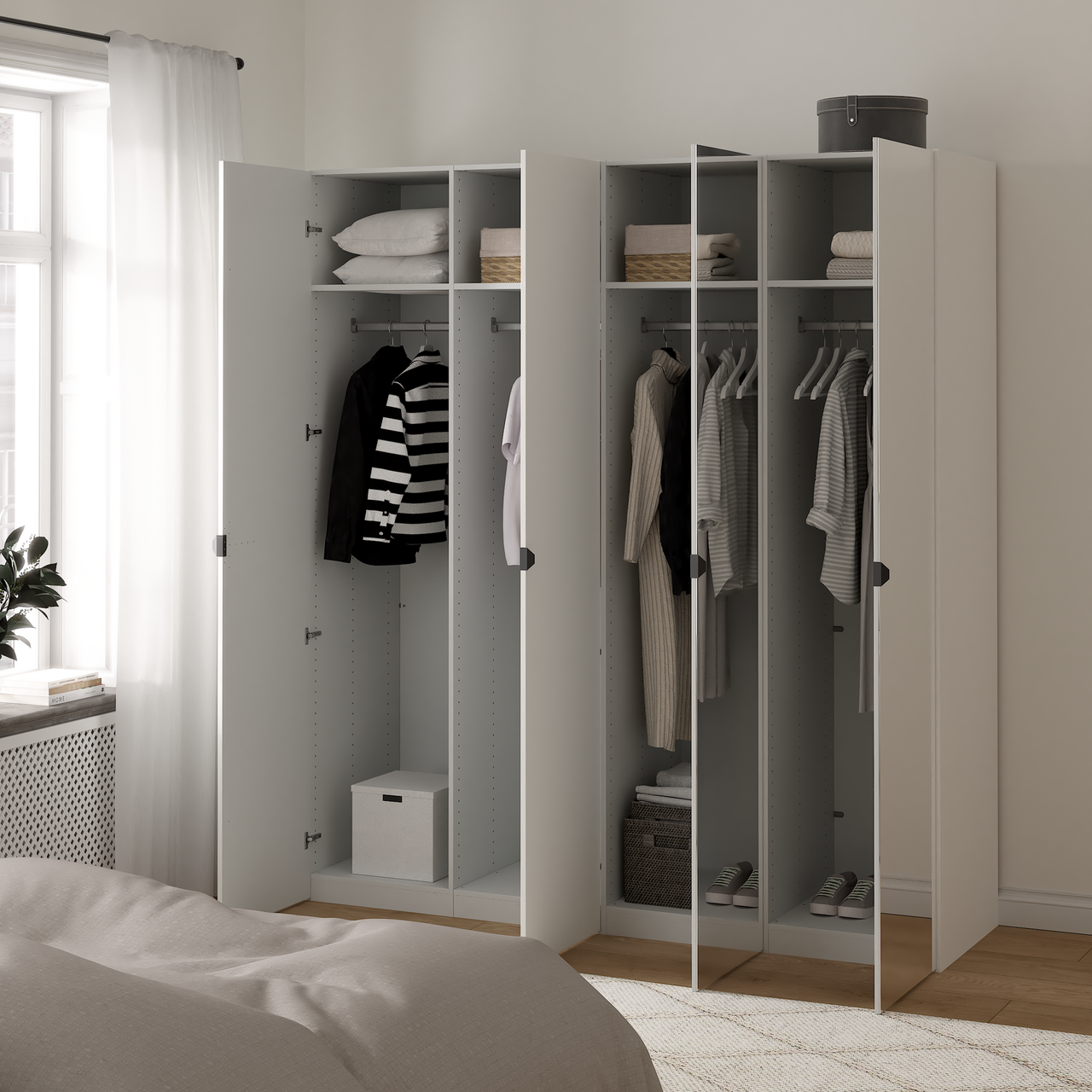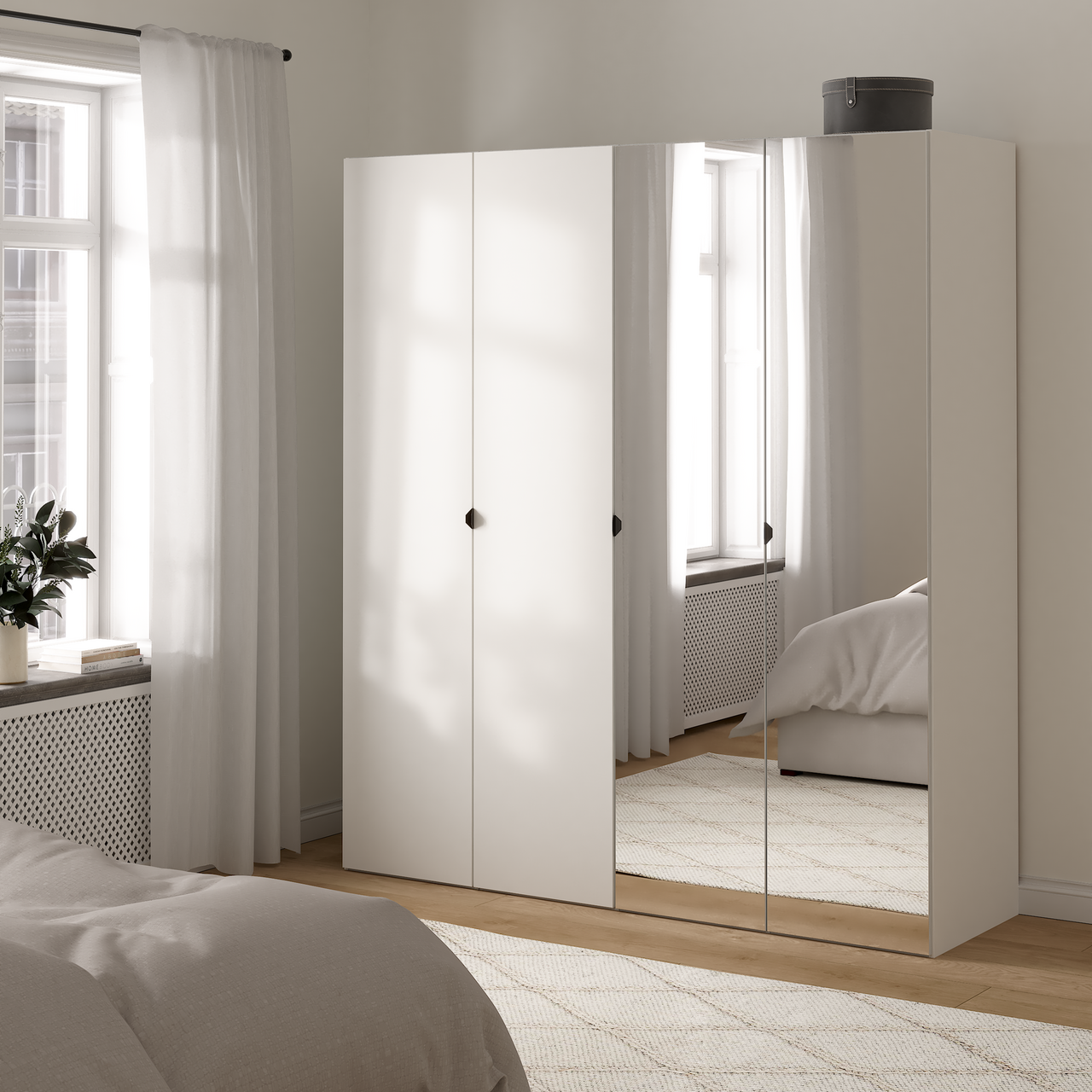 Denne skyvedørsgarderoben fra serien Lind Nest har et moderne design med en kombinasjon av hvite fronter og speilfronter, og passer godt inn i ethvert rom i hjemmet.