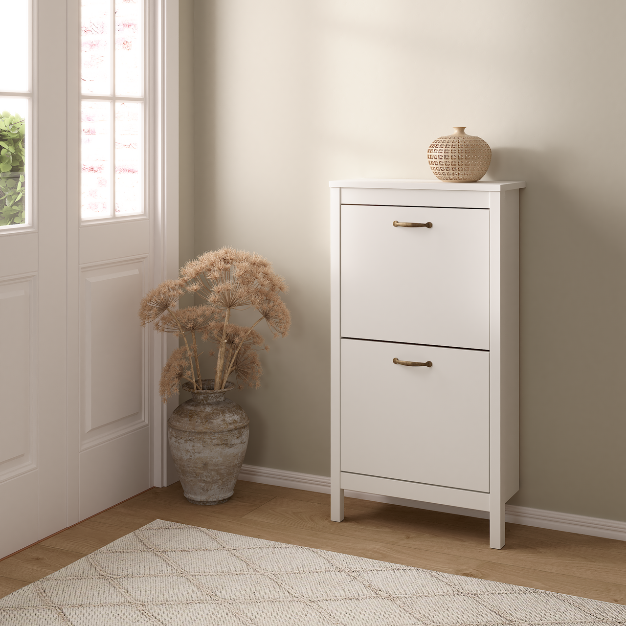 Leona skoskap fra Lind kombinerer en praktisk løsning med plass til opptil 8 par sko. Med fire nedfellbare dører får du en praktisk oppbevaring, samtidig som fottøyet holdes organisert og lett tilgjengelig.