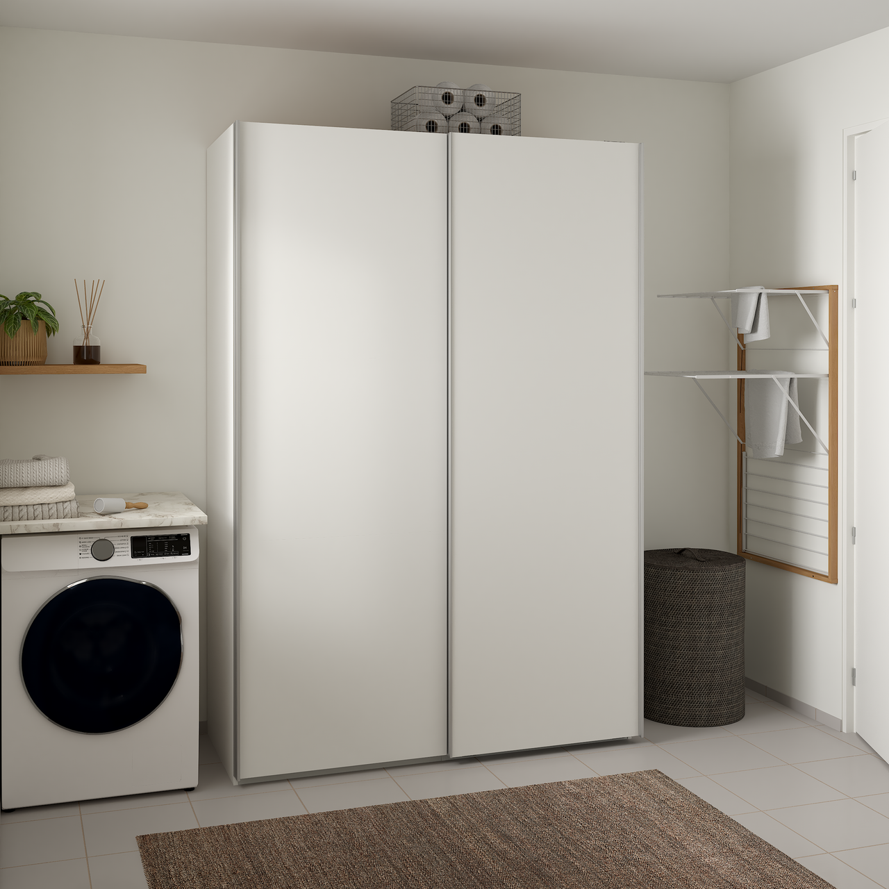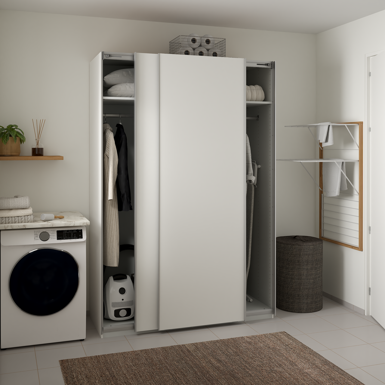 Denne skyvedørsgarderoben fra serien Lind Nest har et tidløst design med hvite fronter, og passer godt inn i ethvert rom i hjemmet.