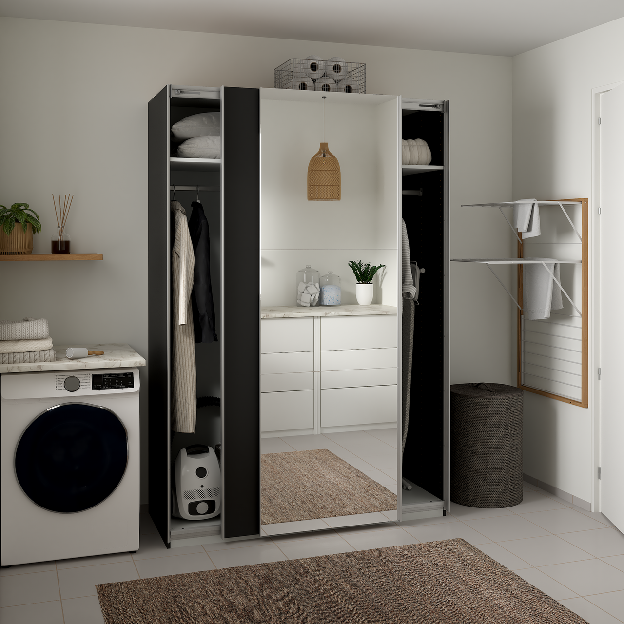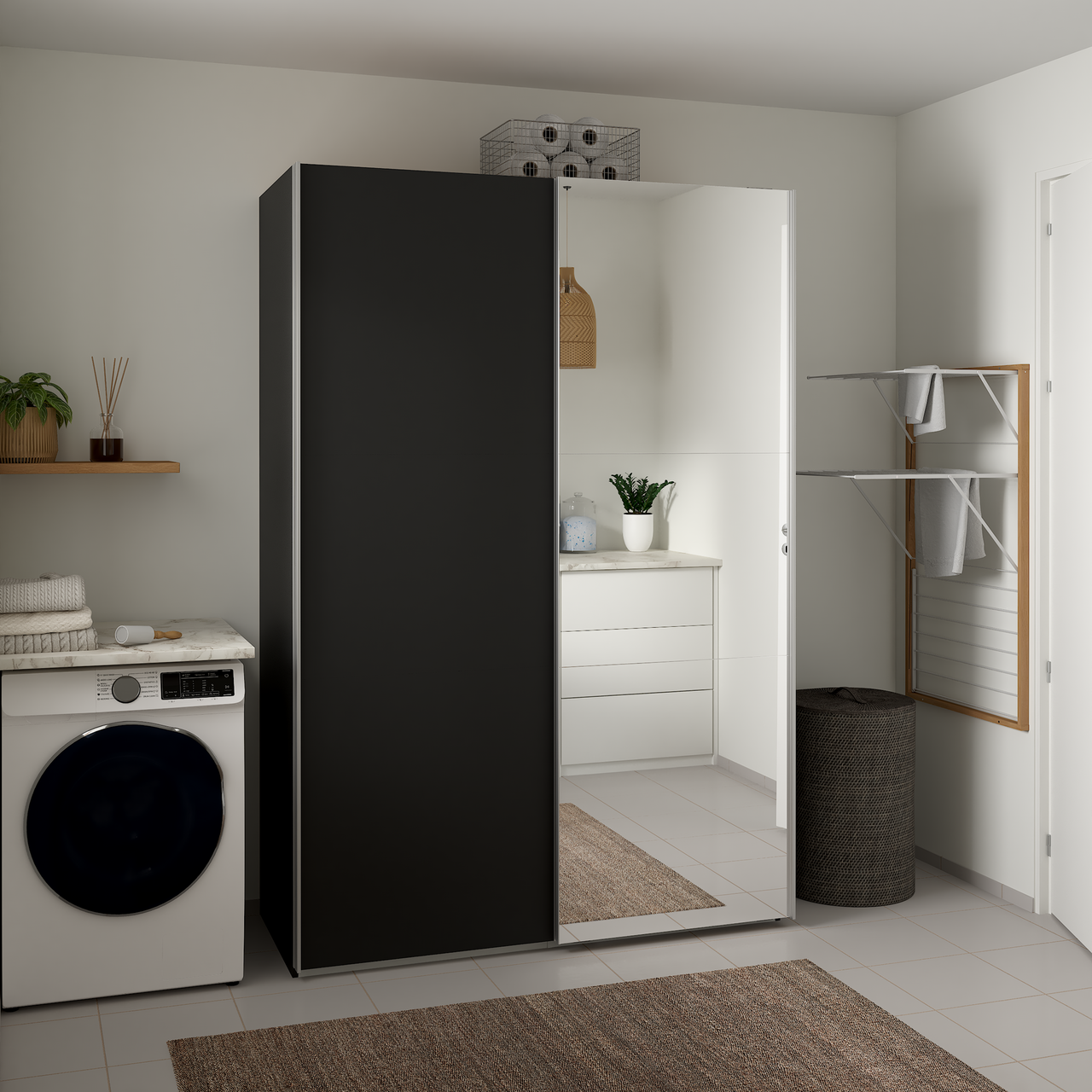 Denne skyvedørsgarderoben fra serien Lind Nest har et moderne design med en kombinasjon av sorte fronter og speilfronter, og passer godt inn i ethvert rom i hjemmet.