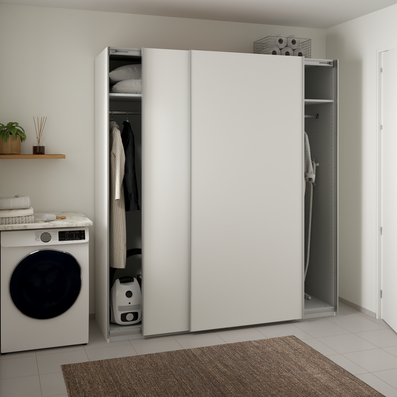 Denne skyvedørsgarderoben fra serien Lind Nest har et tidløst design med hvite fronter, og passer godt inn i ethvert rom i hjemmet.