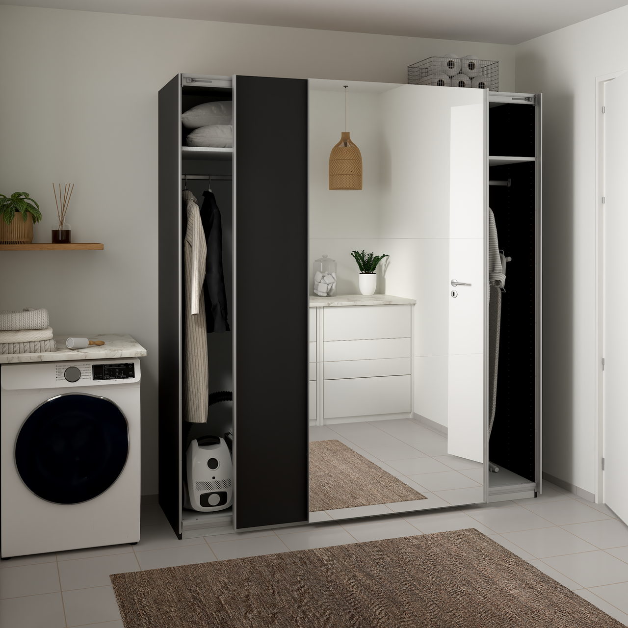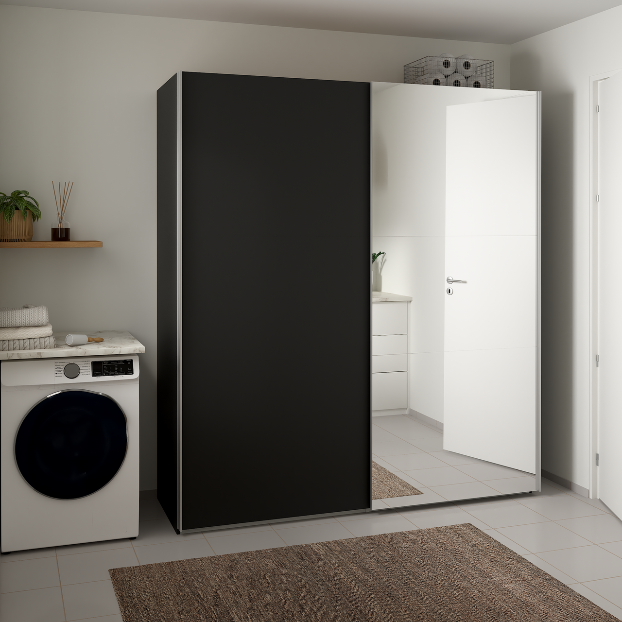 Denne skyvedørsgarderoben fra serien Lind Nest har et moderne design med en kombinasjon av sorte fronter og speilfronter, og passer godt inn i ethvert rom i hjemmet.