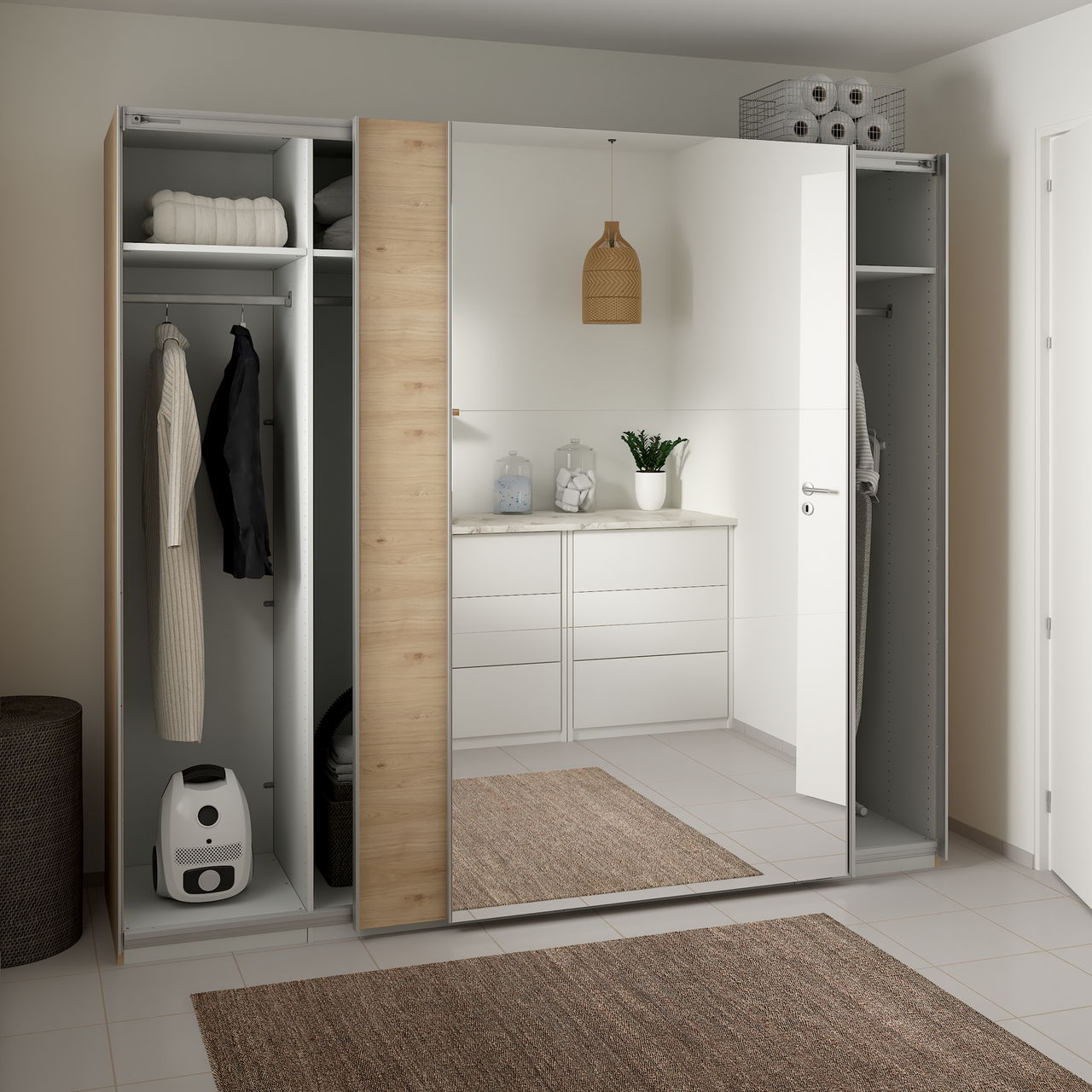 Denne skyvedørsgarderoben fra serien Lind Nest har et minimalistisk design med en kombinasjon av eikefronter og speilfronter, og passer godt inn i ethvert rom i hjemmet.