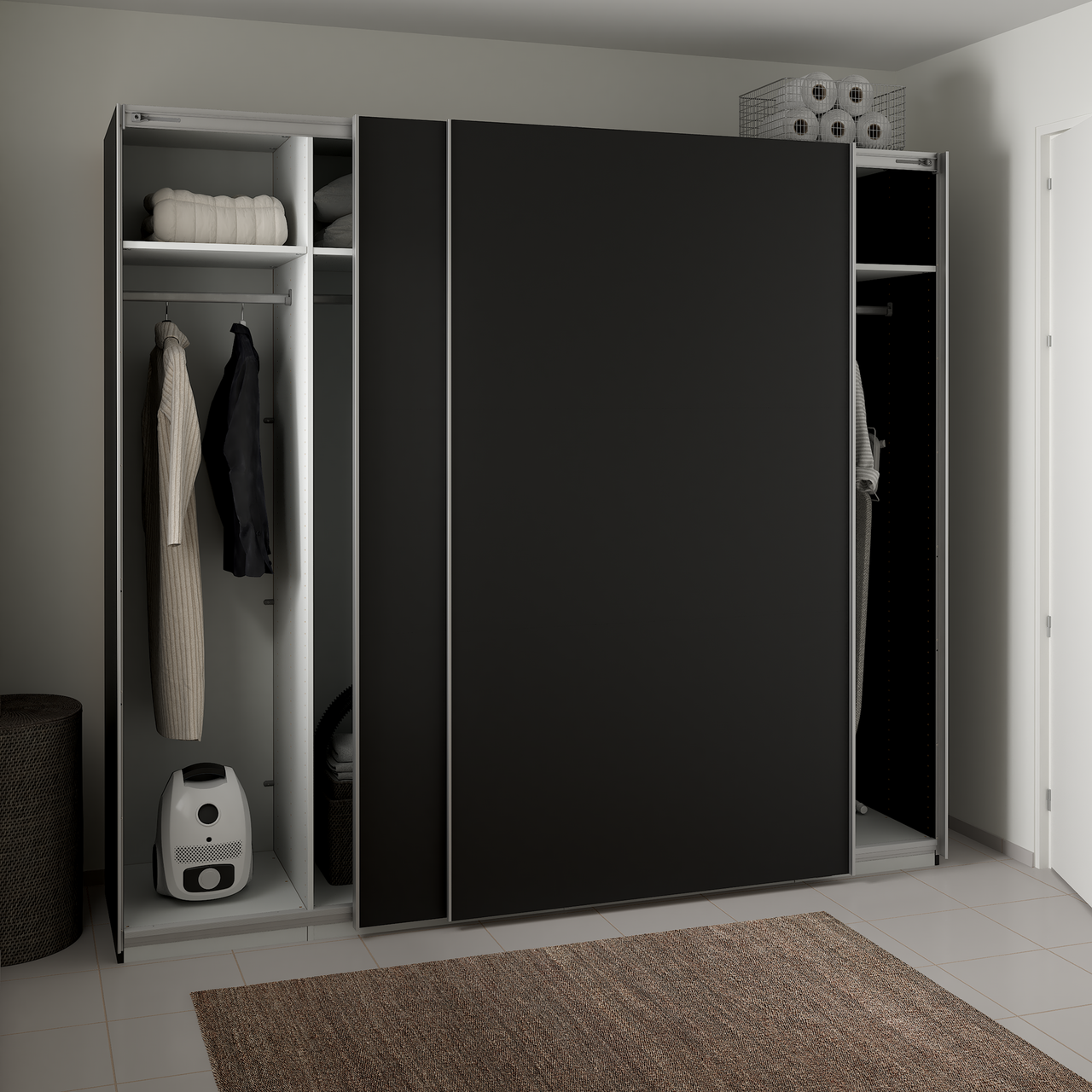 Denne skyvedørsgarderoben fra serien Lind Nest har et moderne design med sorte fronter, og passer godt inn i ethvert rom i hjemmet.