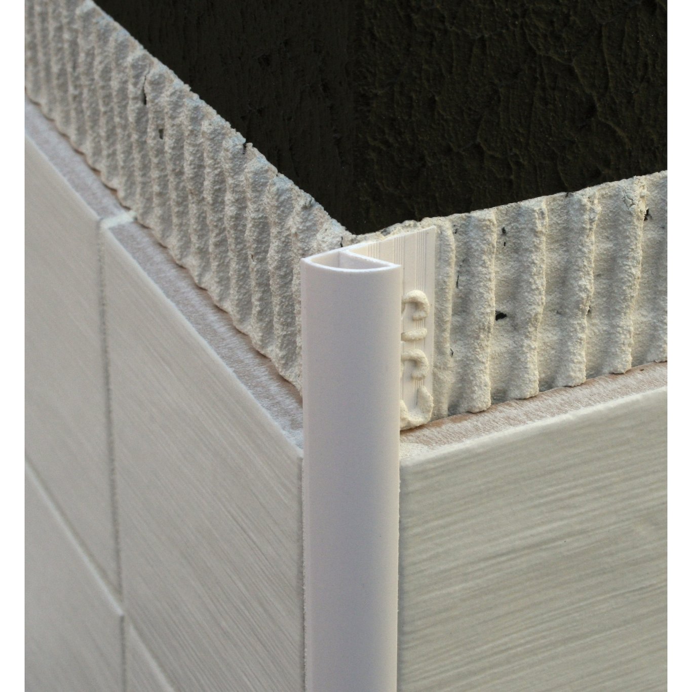 Utvendig hjørnelist for buet hjørneavslutning til flis i hvit farge.