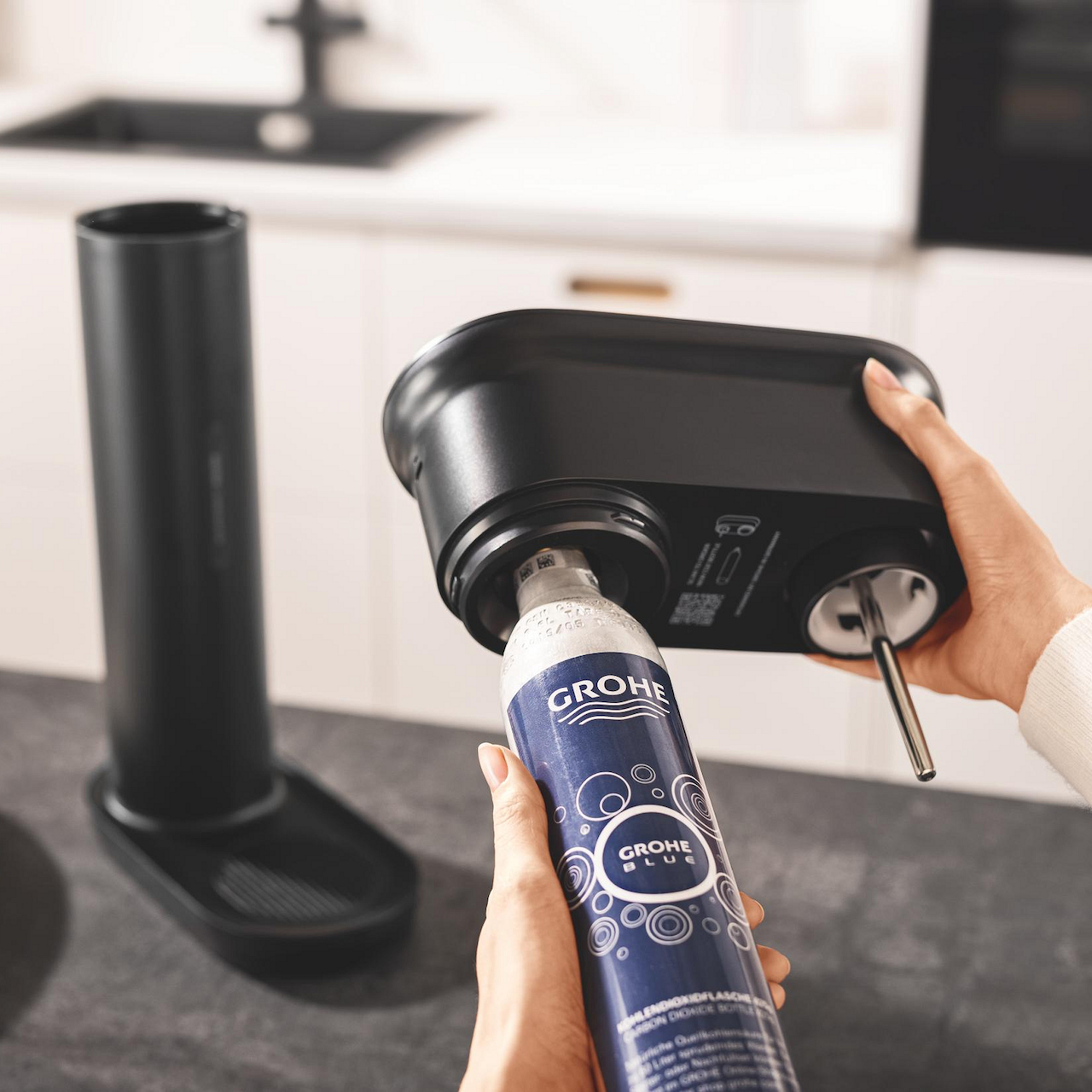 Velg ditt foretrukne CO2-nivå med GROHE Blue Fizz. Den stilrene kullsyremaskinen som glir sømløst inn i din hverdagsrutine.