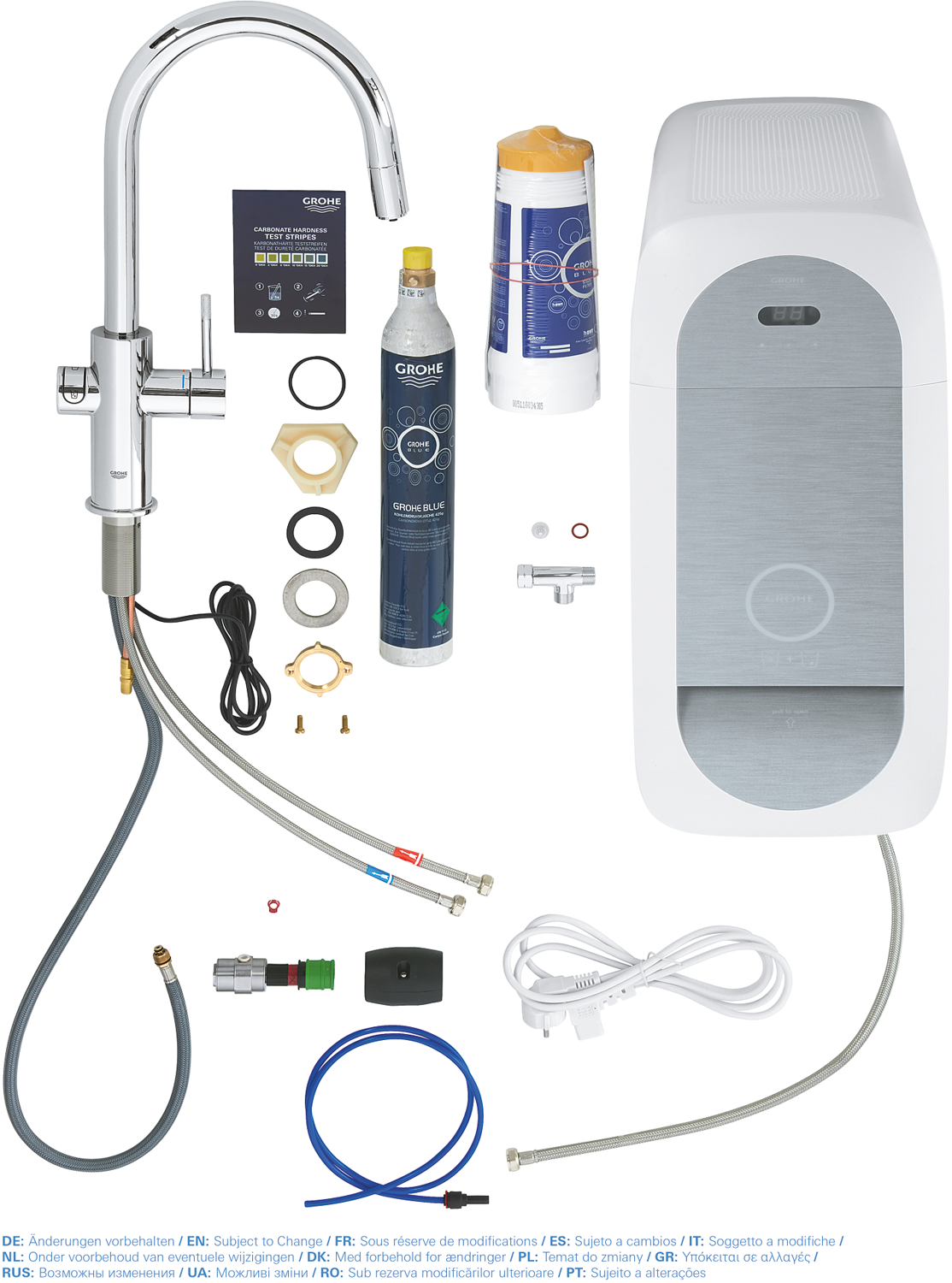 består av:GROHE Blue Home ettgrepsbatteri med rensefilteretthullsmontasjeC-tuttrykknapper for 3 typer filtrert og avkjølt vannstille, medium, musserendeGROHE StarLight-overflateGROHE SilkMove 28 mm keramisk patronuttrekkbar perlatorsvingbar rørtutsvingradius 360°separate vannveier for filtrertog ikke-filtrert vannfleksible tilkoblingsslangerGROHE Blue Home kjølerleverer 3 liter nedkjølt vann med kullsyre per time180 Watt kjøleenhet, 230 V, 50 Hzlydnivå ved standby 44 dB(A)type av beskyttlese IP 21CE-nummerKrever ventilasjonshull i bunnen av kjøkkenskapetProgramvareoppsett og overvåking av filter og CO<sub>2</sub> kapasitet mulig via GROHE Ondus appmed Bluetooth 4.0* og WIFI-grensesnitt for trådløs datakommunikasjonfor Apple** og Android enheterBluetooth rekkevidde (max. 10 m) varierer avhengig av debrukte materialene og vegger mellom avsender og mottakerjusterbar for GROHE Blue filtrer størrelse S, GROHE Blue aktivert karbon filter og GROHE Blue magnesium + filterGROHE Blue filter str. S, filter, hode med justerbar vannstyrkefor regioner med vannhardhet på mer enn 9 ° dKHFor regioner med vannhardhet under 9 ° dKH,vennligst bestil vårt karbonfilter 40 547 001GROHE Blue 425 g CO<sub>2</sub> flaskeSystemkrav AppleiPhone med iOS 12.0 eller nyereSystemkrav AndroidSmarttelefon med Android 6.0 eller nyereMobilenheter og GROHE Watersystems App*** er ikke inkludert i leveransen og må bestilles/installeres separat via en autorisert Apple-forhandler/Apple Store/iTunes eller Google Play Store.* Bluetooth merket og logo er registrerte varemerker som eies av Bluetooth SIG, Inc. og all bruk av dette varemerket av Grohe AG er under lisens. Andre varemerker og enheter er under respektive eiere.** Apple, Apple logoen, iPod, iPod Touch, iPhone og iTunes er varemerker under Apple Inc., registrert i USA og andre land. Apple er ikke ansvarlig for funksjonen til denne enheten eller overholdelsen av sikkerhets- og forskriftsstandarder.*** Tilgjengelig grats i iTunes eller i Google Play store.Dette produktet inneholder stoffer som er erklært som et farlig stoff. Finn mer informasjon i sikkerhetsdatabladet. Du kan laste ned sikkerhetsdataene på: www.grohe.com/safety-data-sheets/Vann- og avløpsinstallasjoner må installeres av rørlegger.